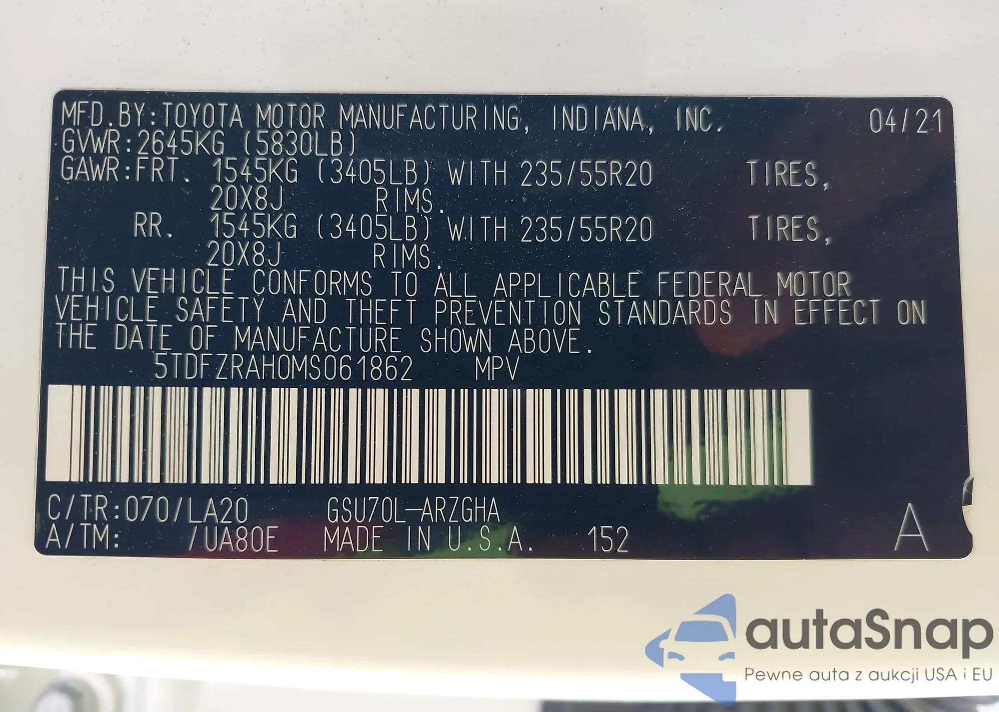 • VIN: 5TDFZRAH0MS061862