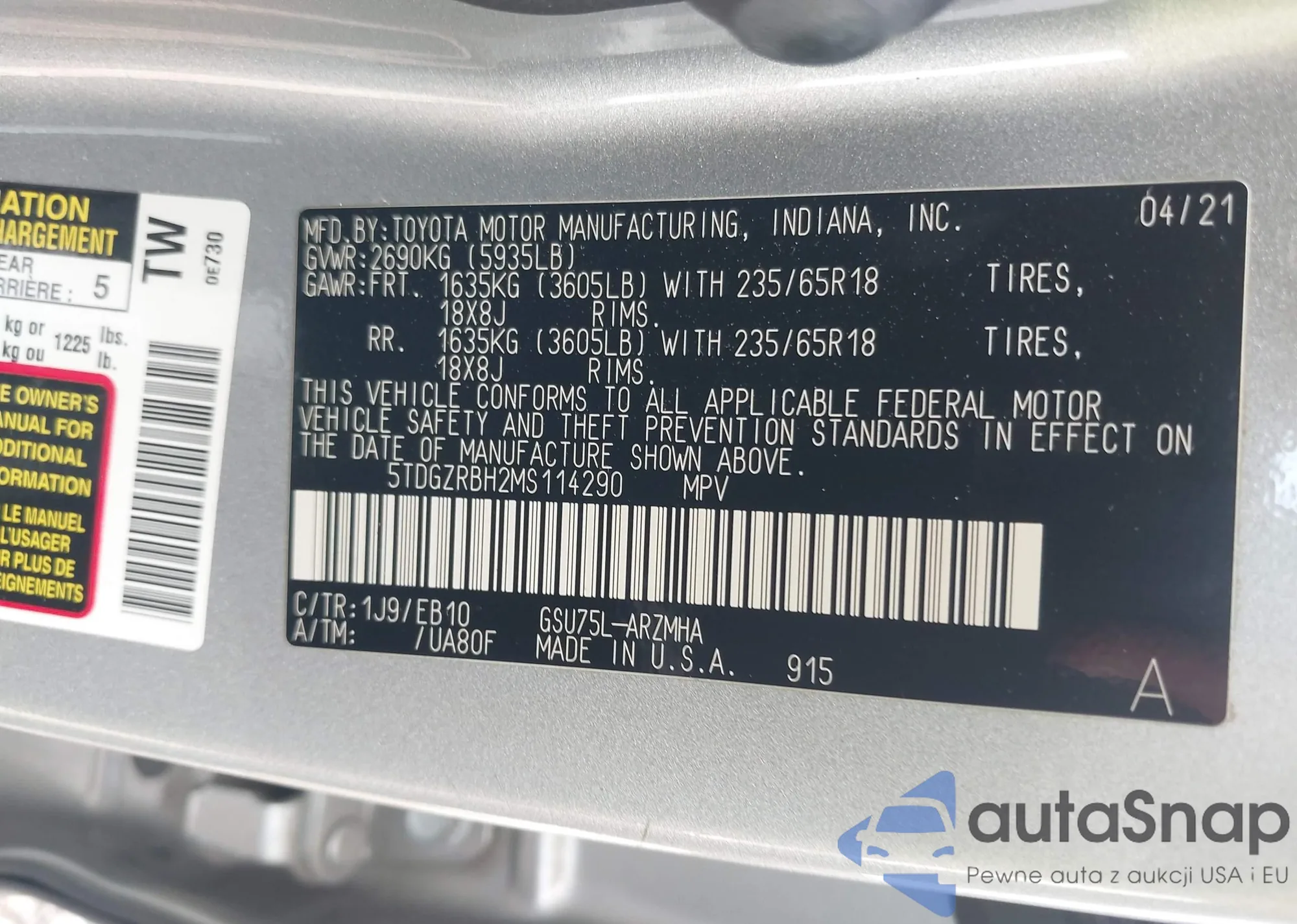 • VIN: 5TDGZRBH2MS114290