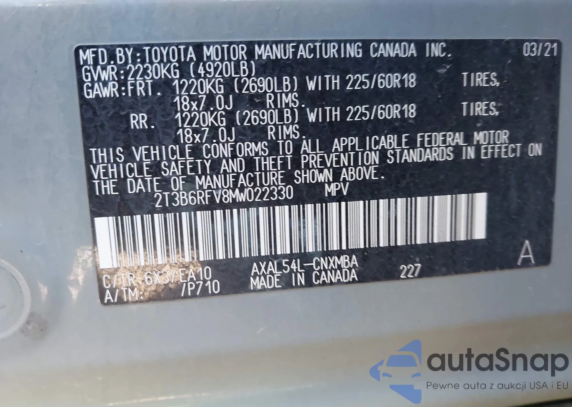 The car Toyota RAV 4 2021 (VIN 2T3B6RFV8MW022330) is sold by an unverified seller. We recommend checking the Carfax report and confirming registration possibilities before purchase.