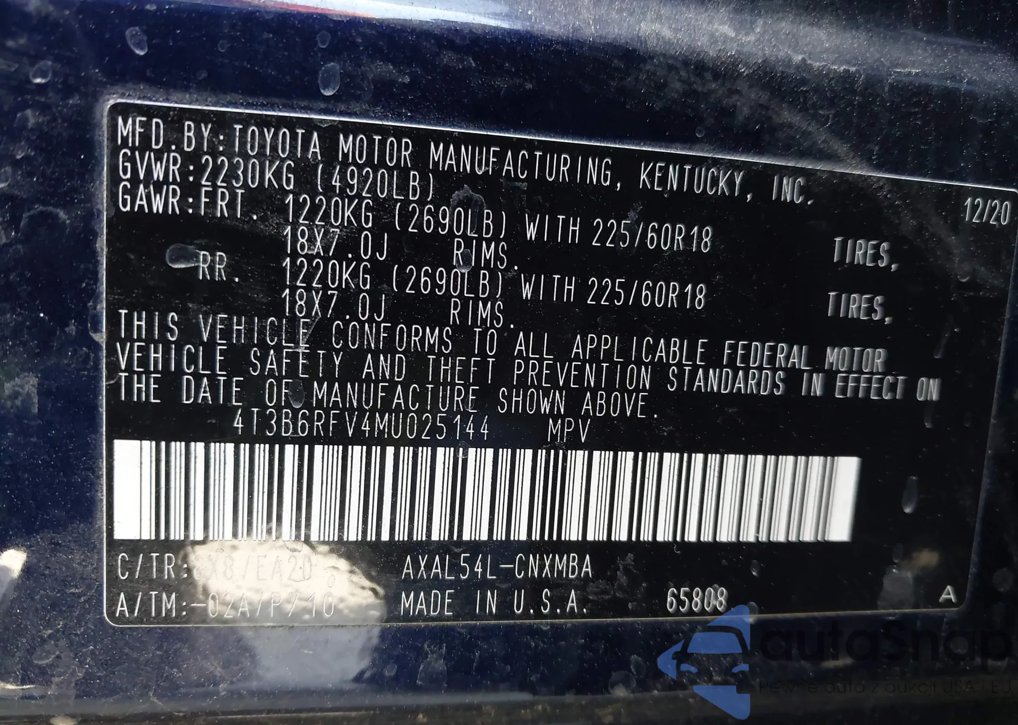 VIN: 4T3B6RFV4MU025144