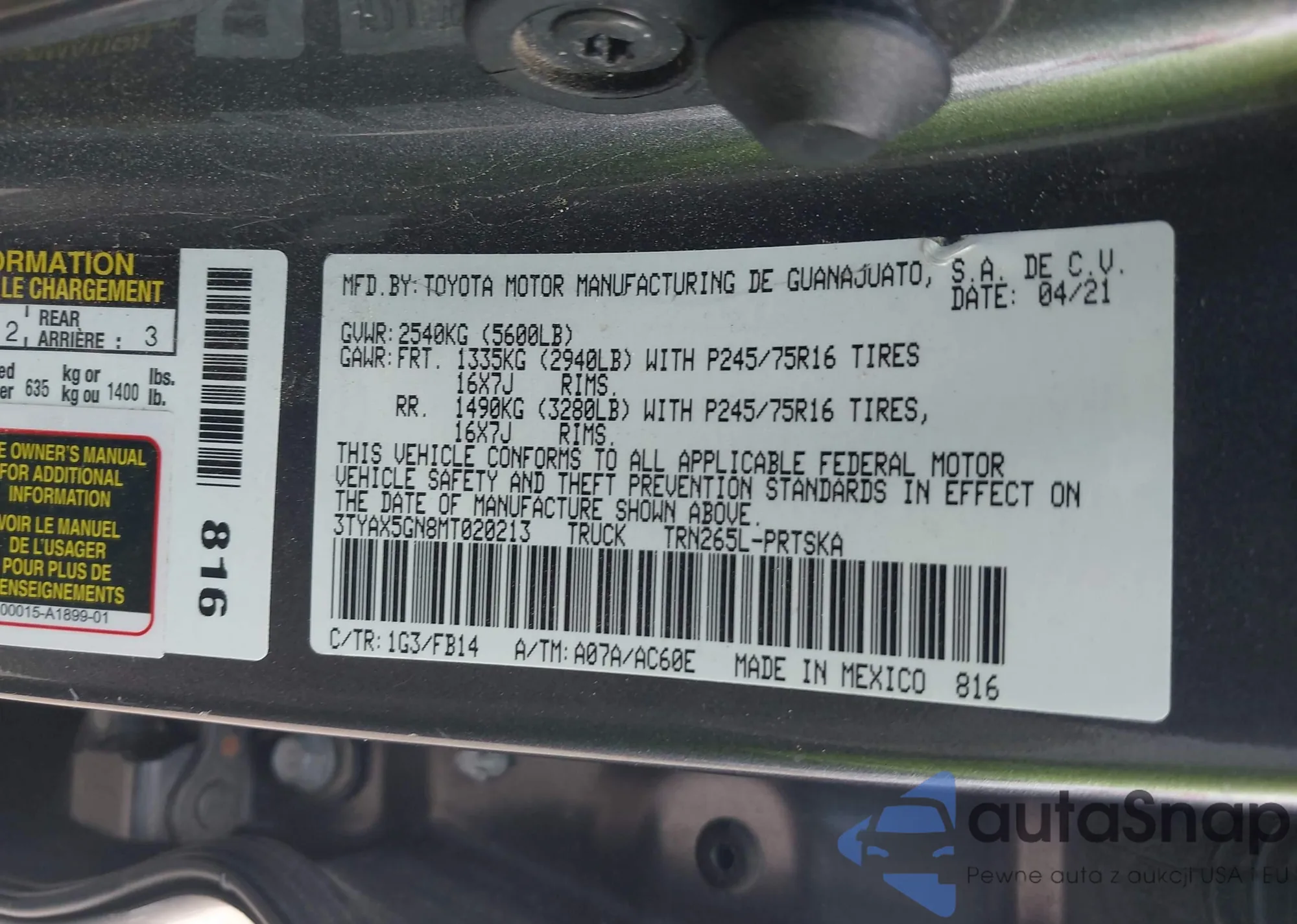 VIN: 3TYAX5GN8MT020213