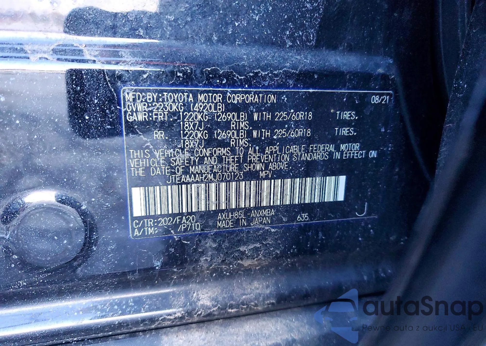 The car Toyota Venza 2021 (VIN JTEAAAAH2MJ070123) has not been auctioned before. The documents are clean, and the mileage matches or is below the market average. Sold by an insurance company – we recommend purchase. Delivery to the port will take approx. 6–8 weeks.
