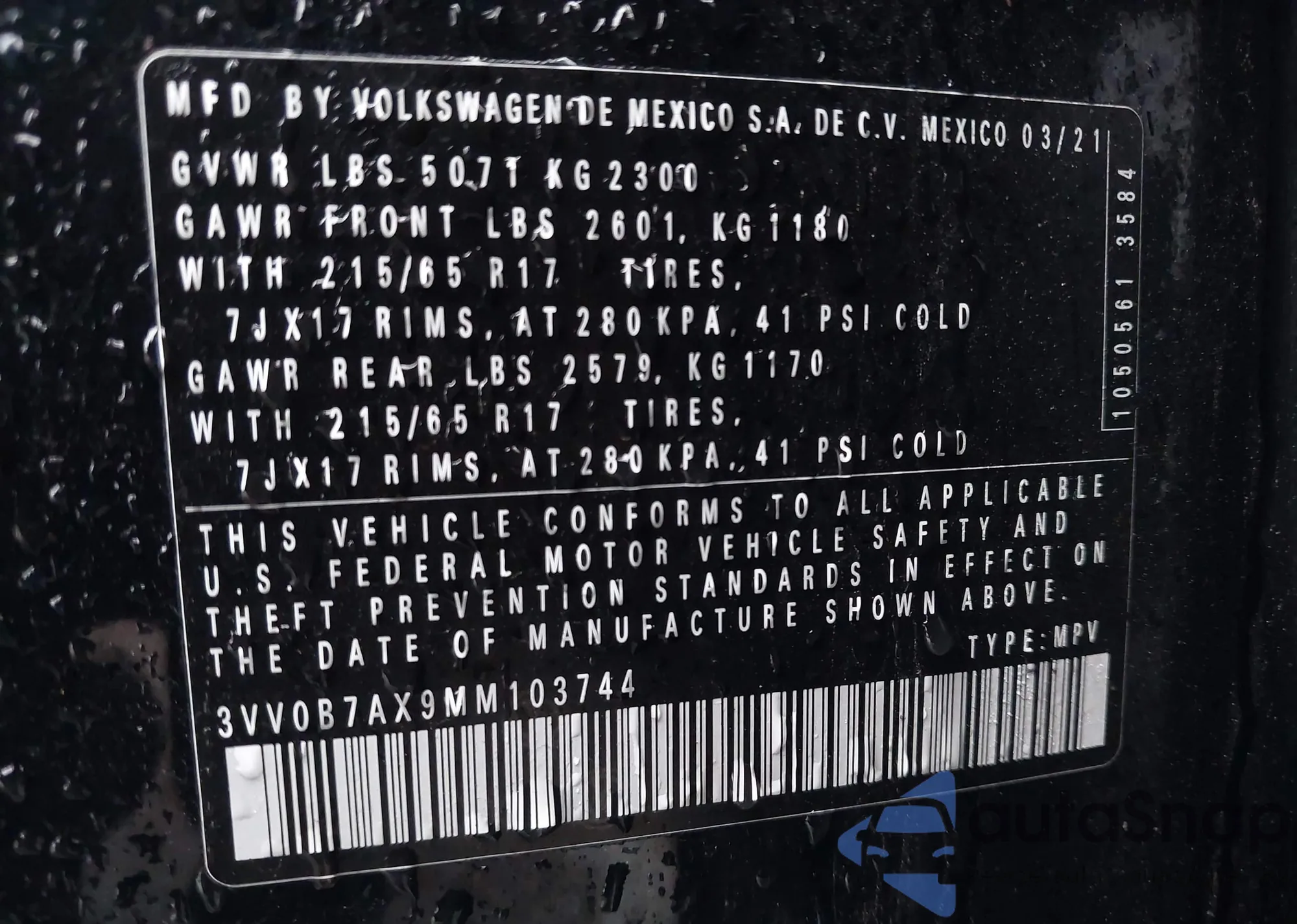 The car Volkswagen Tiguan 2021 (VIN 3VV0B7AX9MM103744) has not been auctioned before. The documents are clean, and the mileage matches or is below the market average. Sold by an insurance company – we recommend purchase. Delivery to the port will take approx. 6–8 weeks.