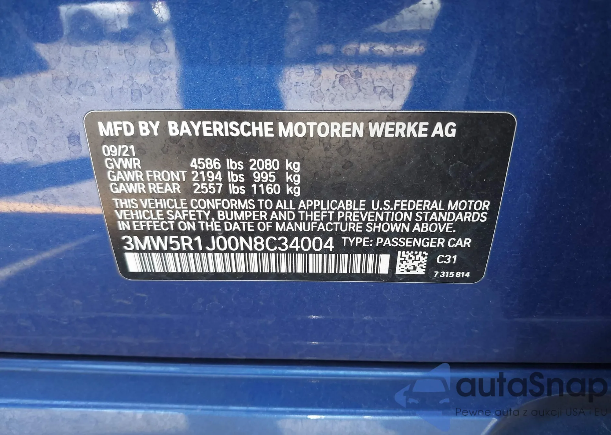 The car BMW 3er 2022 (VIN 3MW5R1J00N8C34004) has documents that prevent registration. Export and registration may be difficult. Contact AutaSnap experts to find alternatives.