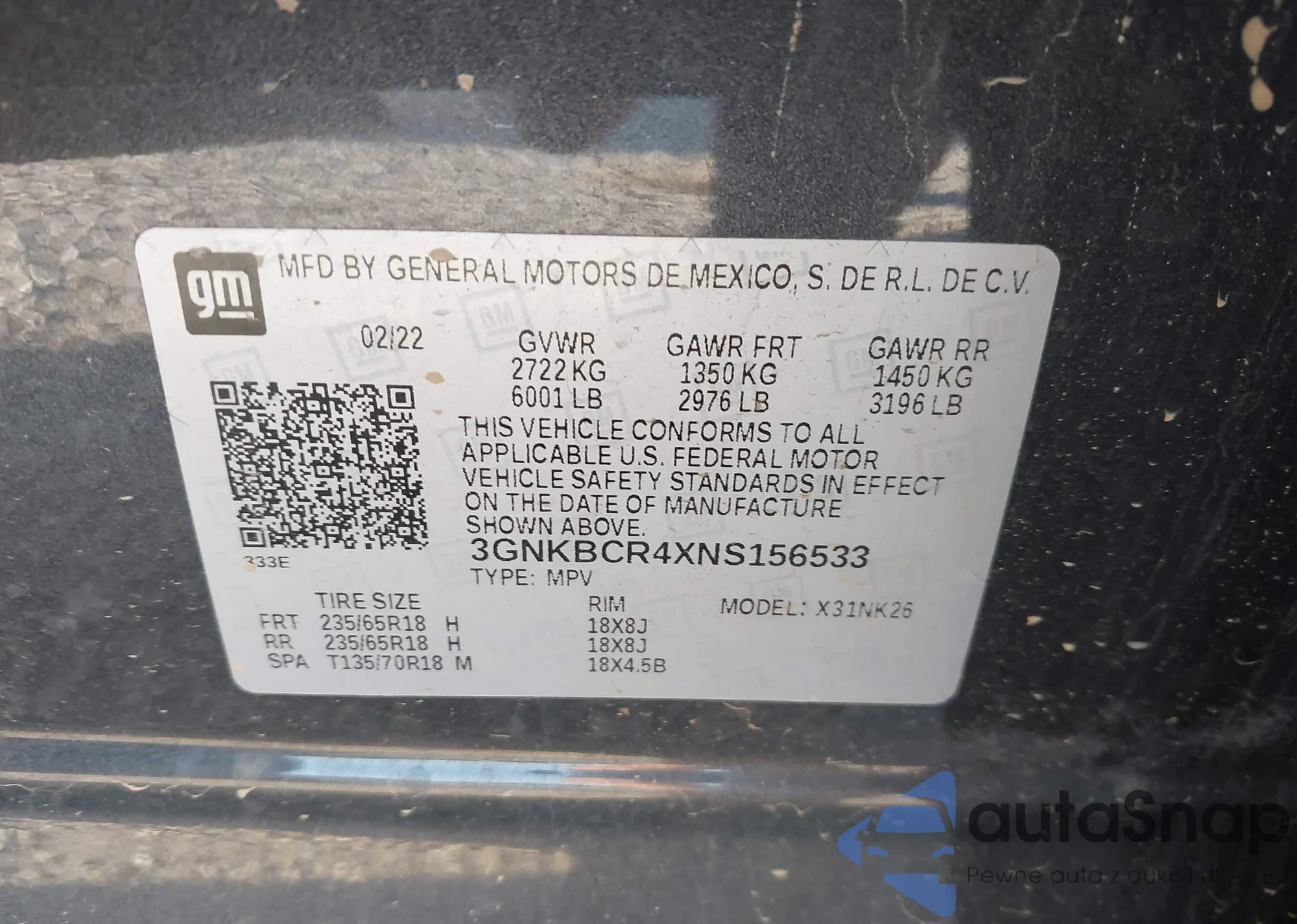 VIN: 3GNKBCR4XNS156533