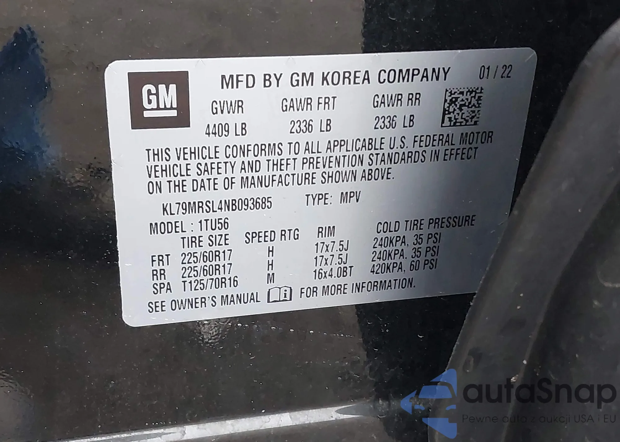 VIN: KL79MRSL4NB093685