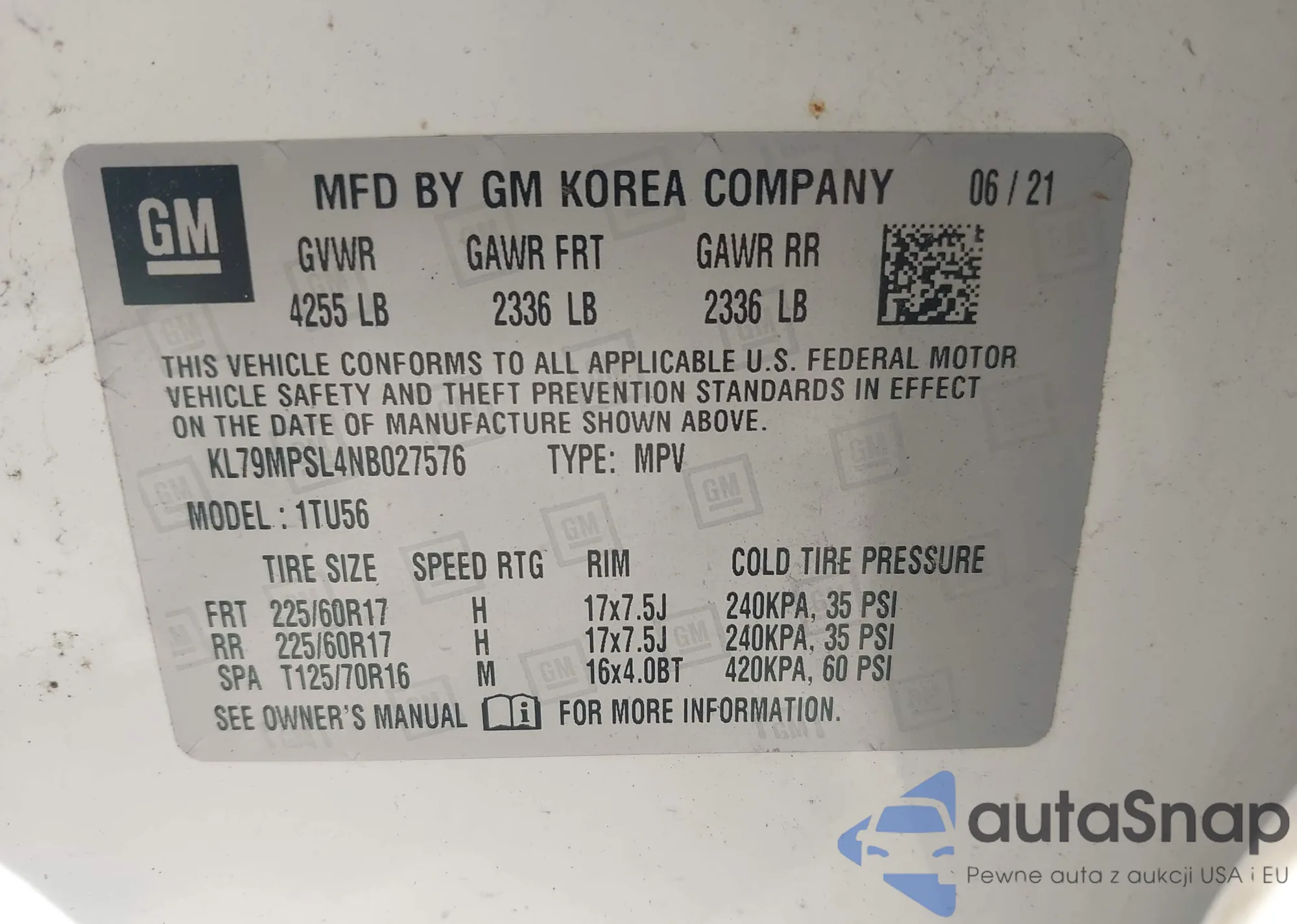 The car Chevrolet TrailBlazer 2022 (VIN KL79MPSL4NB027576) has not been auctioned before. The documents are clean, and the mileage matches or is below the market average. Sold by an insurance company – we recommend purchase. Delivery to the port will take approx. 6–8 weeks.
