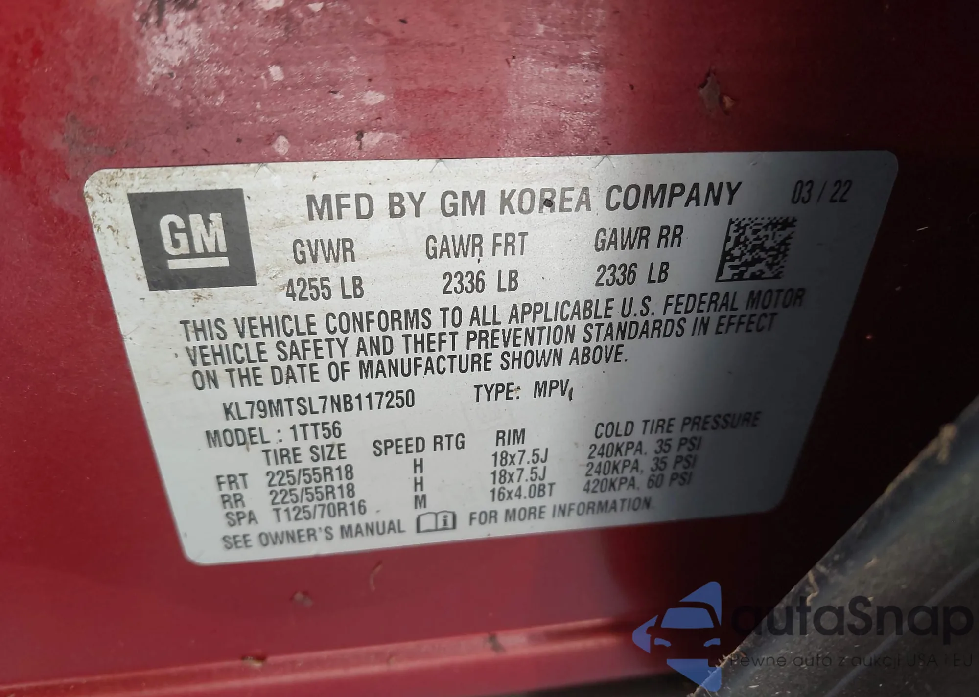 The car Chevrolet TrailBlazer 2022 (VIN KL79MTSL7NB117250) has not been auctioned before. The documents are clean, and the mileage matches or is below the market average. Sold by an insurance company – we recommend purchase. Delivery to the port will take approx. 6–8 weeks.