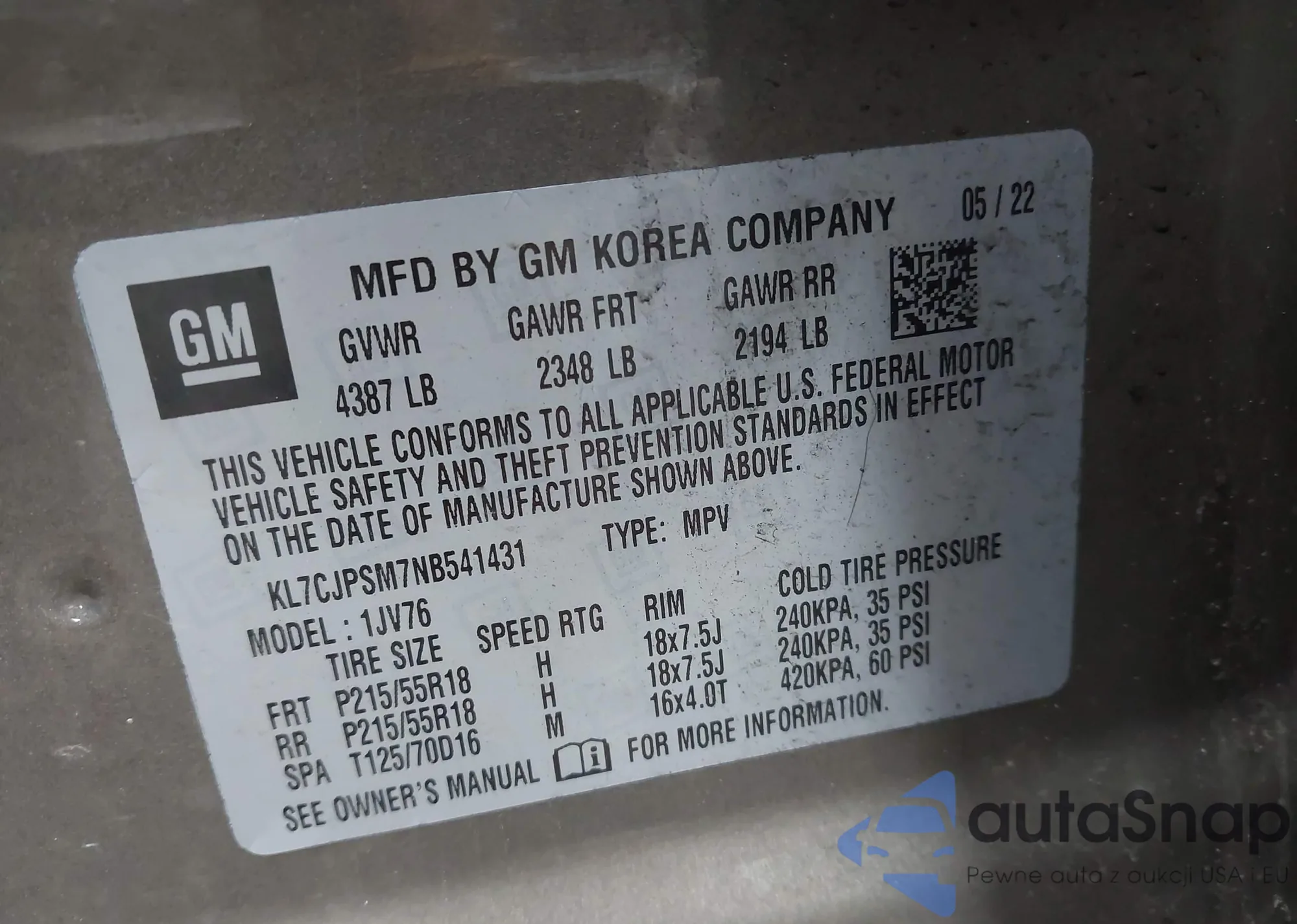 VIN: KL7CJPSM7NB541431