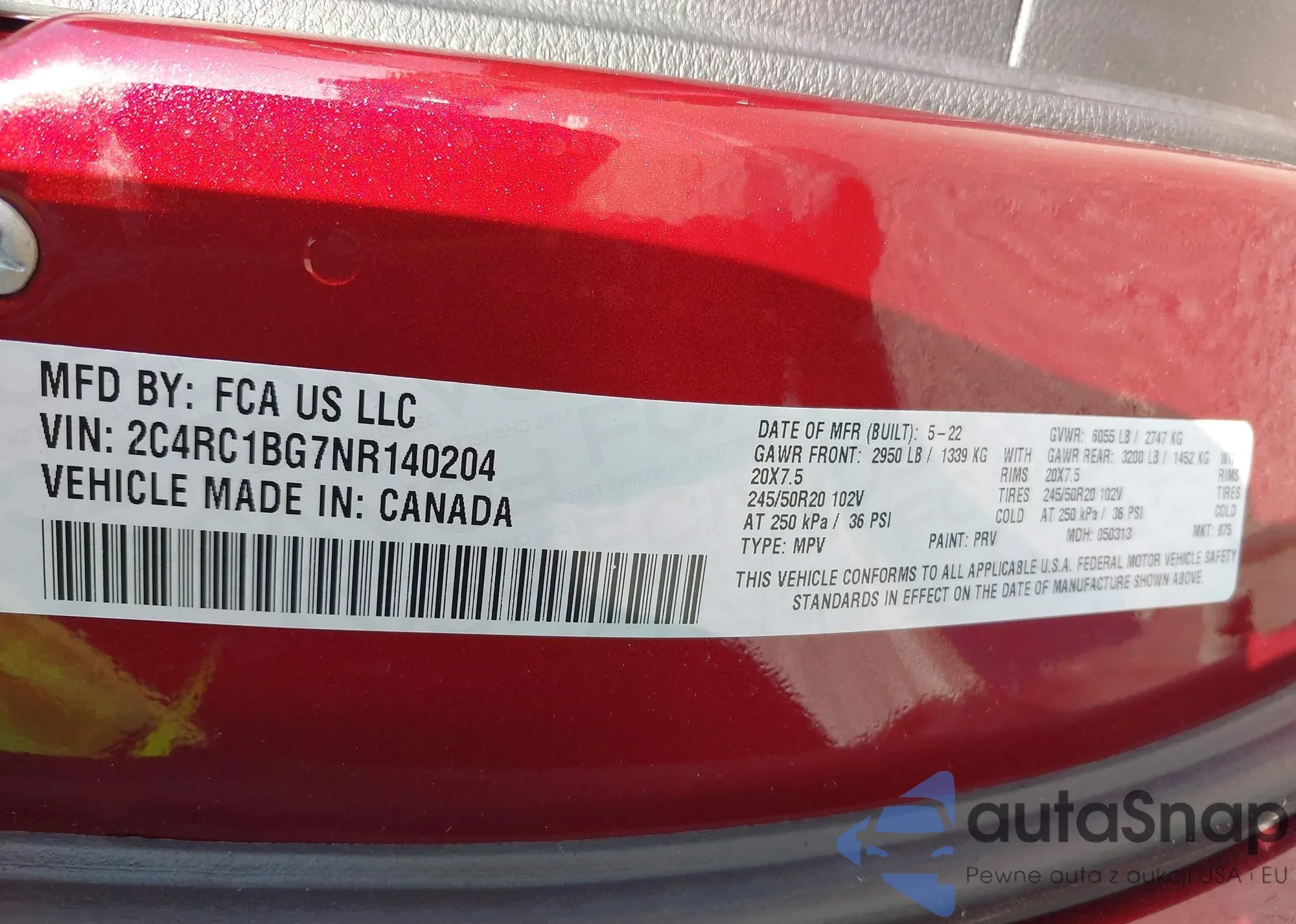 The car Chrysler Pacifica 2022 (VIN 2C4RC1BG7NR140204) has not been auctioned before. The documents are clean, and the mileage matches or is below the market average. Sold by an insurance company – we recommend purchase. Delivery to the port will take approx. 6–8 weeks.