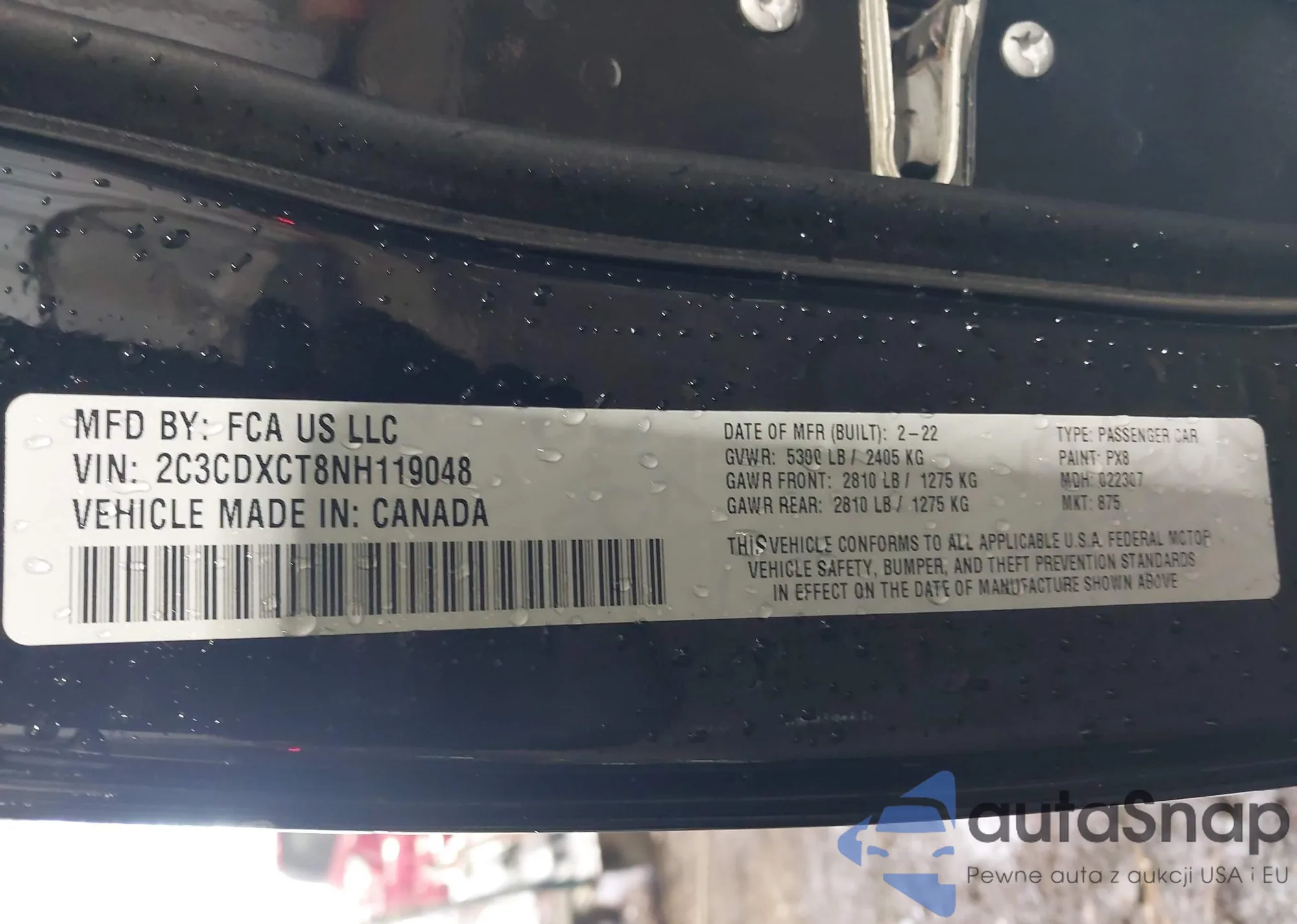 The car Dodge Charger 2022 (VIN 2C3CDXCT8NH119048) has not been auctioned before. The documents are clean, and the mileage matches or is below the market average. Sold by an insurance company – we recommend purchase. Delivery to the port will take approx. 6–8 weeks.