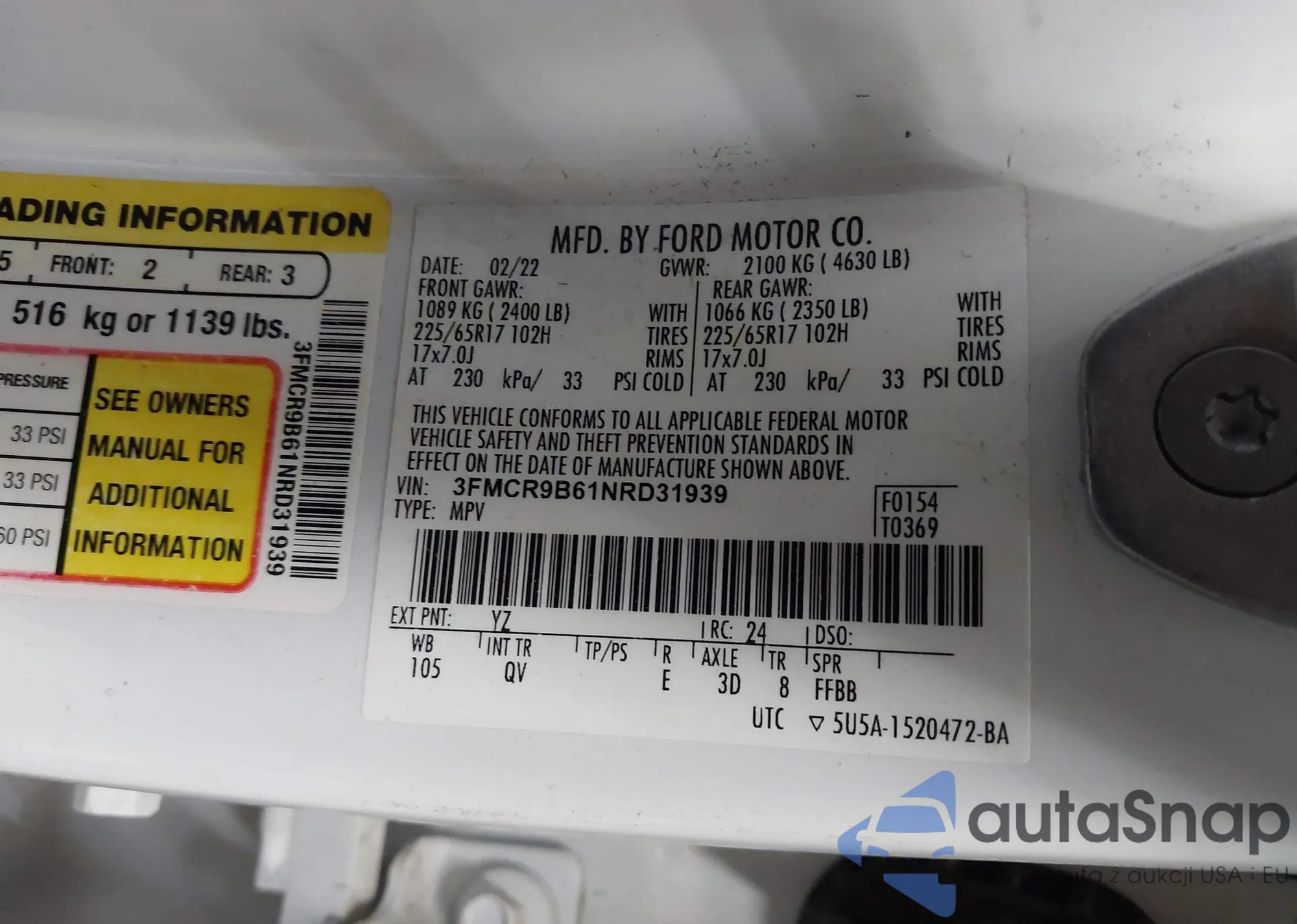 The car Ford Bronco Sport 2022 (VIN 3FMCR9B61NRD31939) has not been auctioned before. The documents are clean, and the mileage matches or is below the market average. Sold by an insurance company – we recommend purchase. Delivery to the port will take approx. 6–8 weeks.