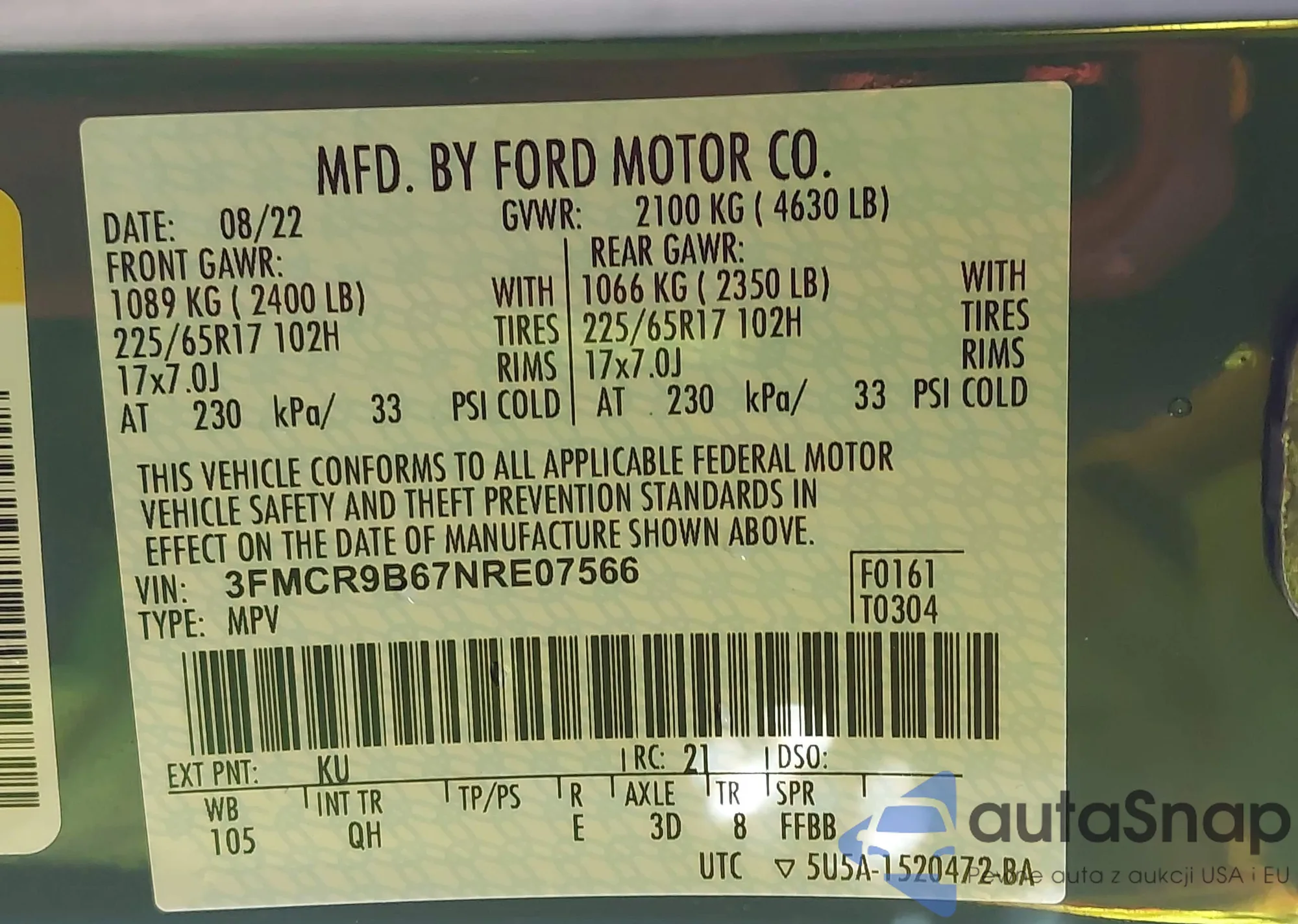 VIN: 3FMCR9B67NRE07566