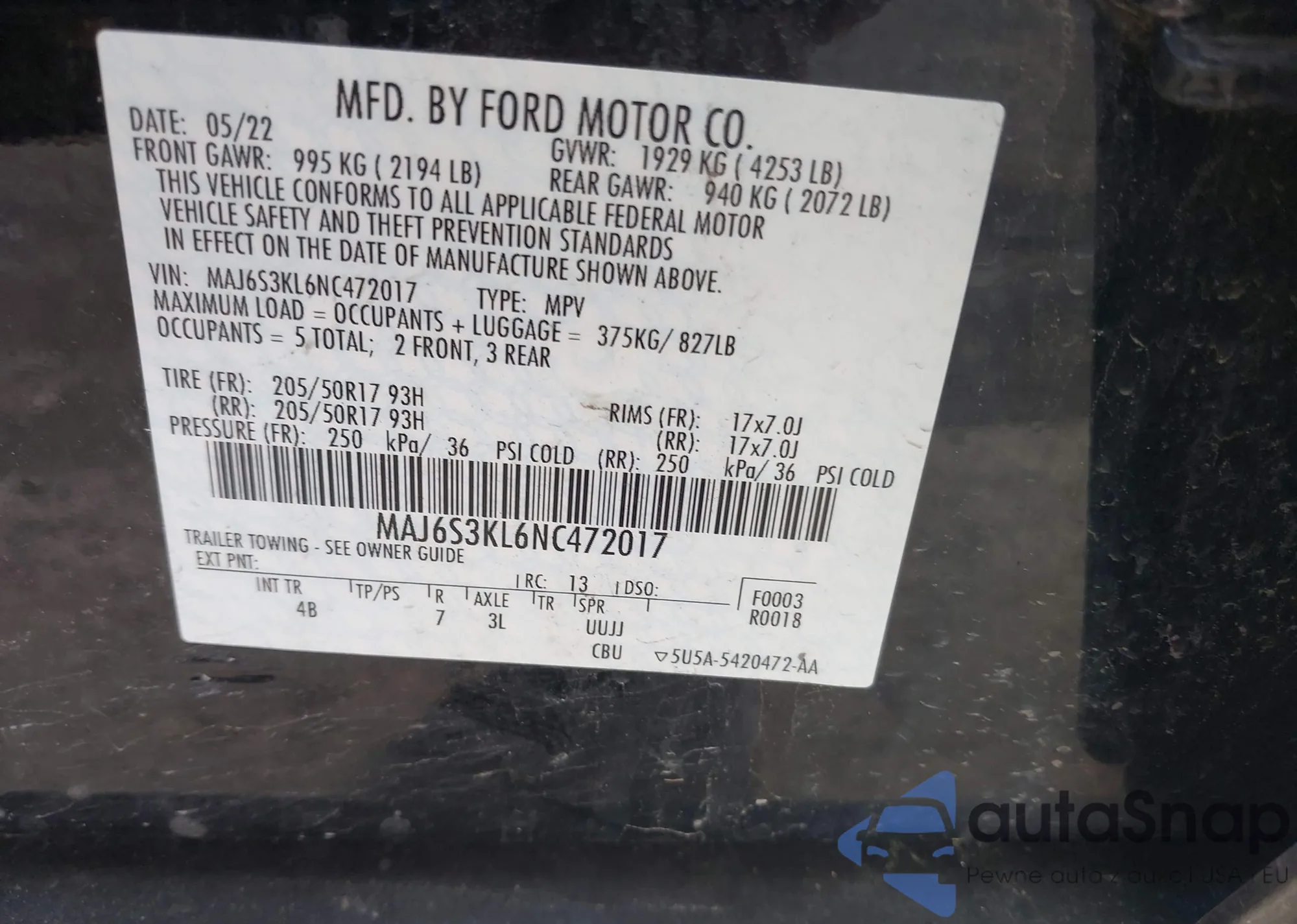 VIN: MAJ6S3KL6NC472017