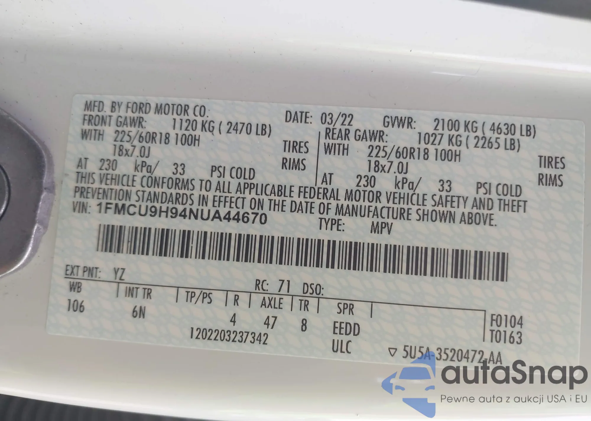 • VIN: 1FMCU9H94NUA44670