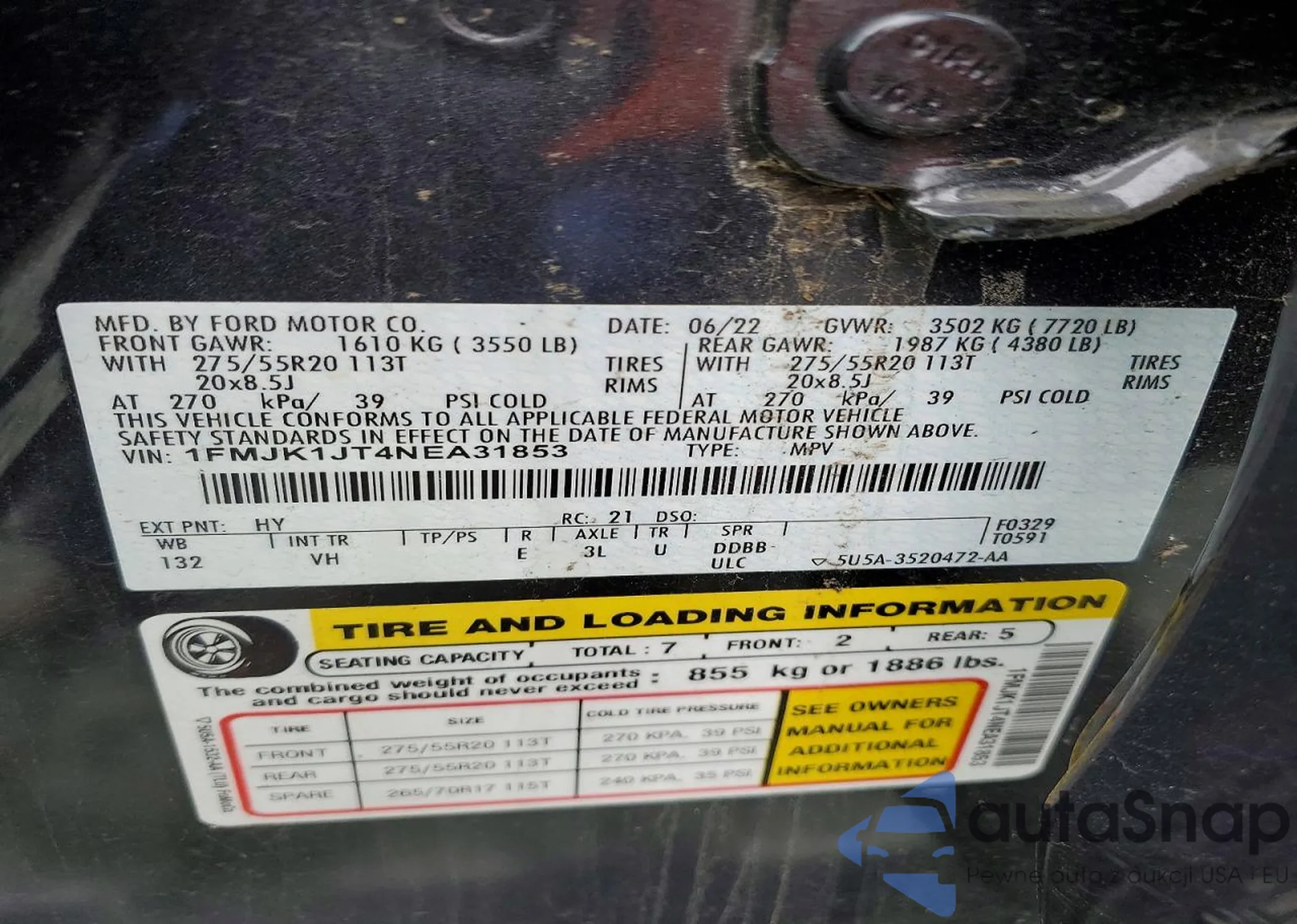 The car Ford Expedition 2022 (VIN 1FMJK1JT4NEA31853) is sold by an unverified seller. We recommend checking the Carfax report and confirming registration possibilities before purchase.