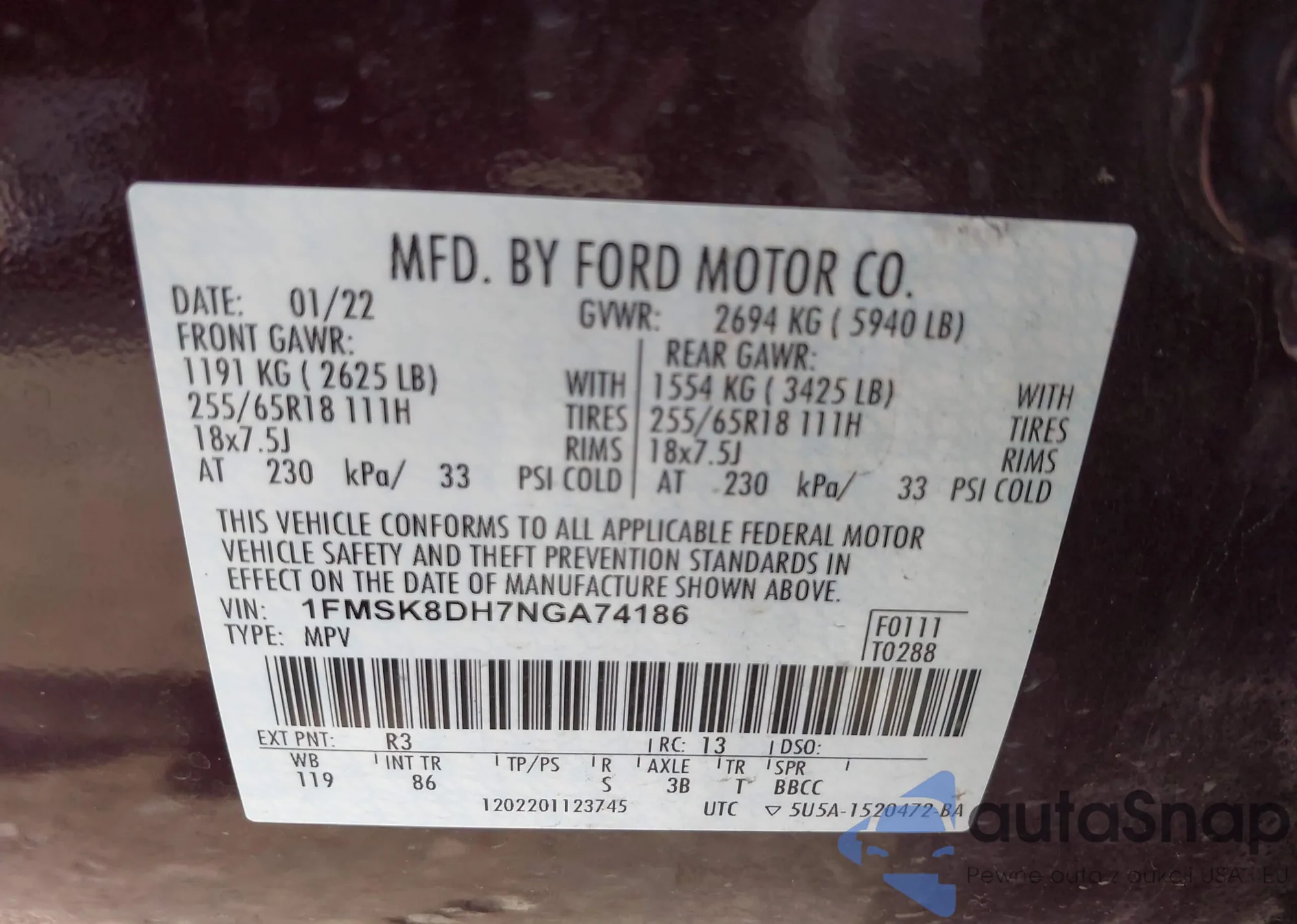 VIN: 1FMSK8DH7NGA74186