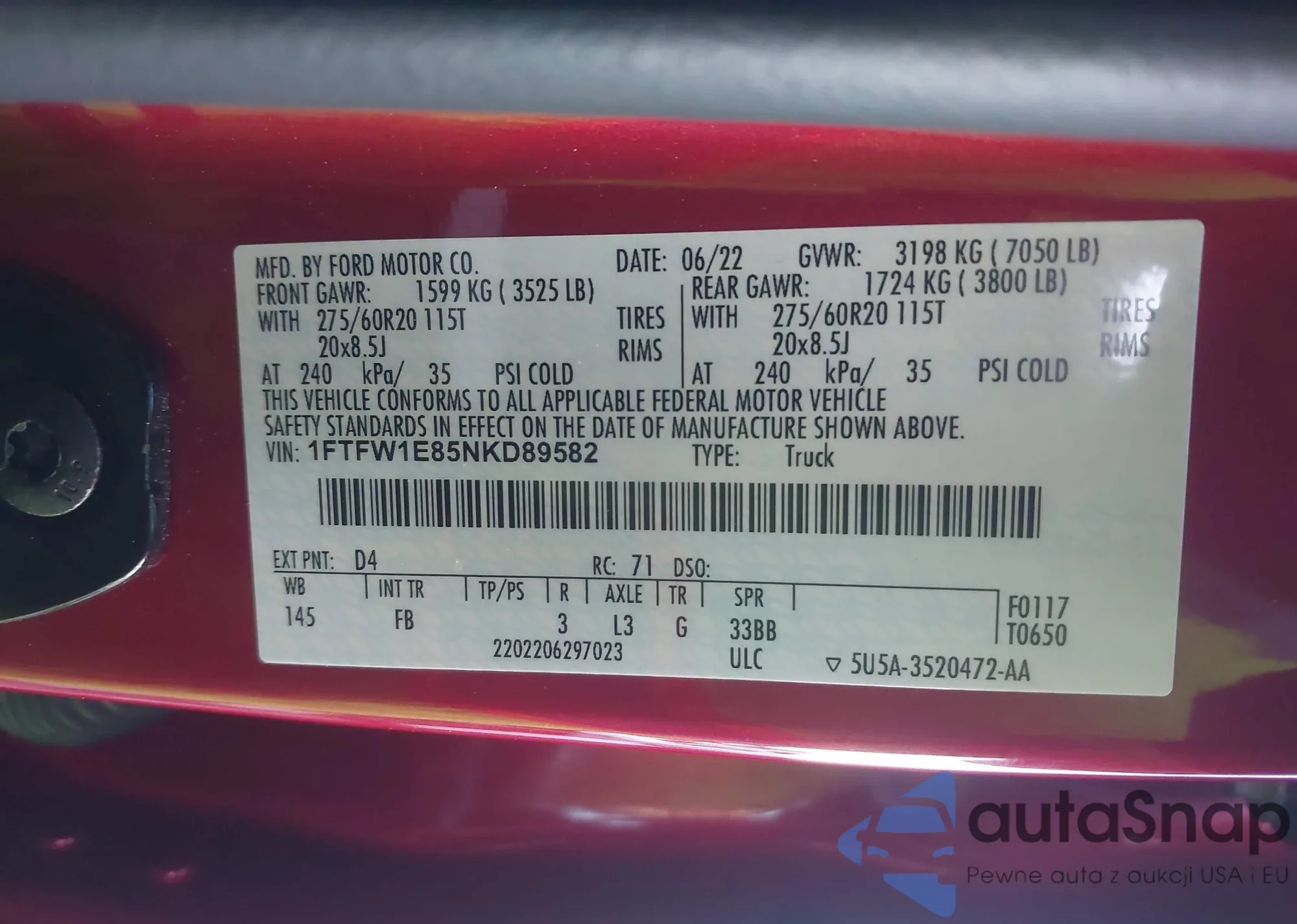 • VIN: 1FTFW1E85NKD89582
