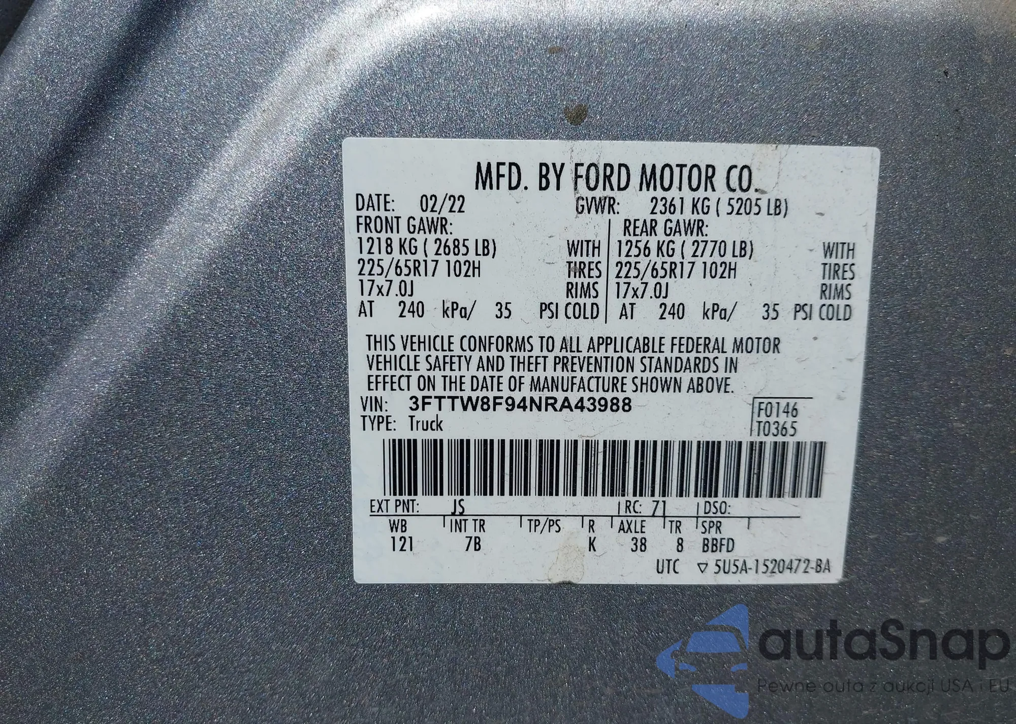VIN: 3FTTW8F94NRA43988