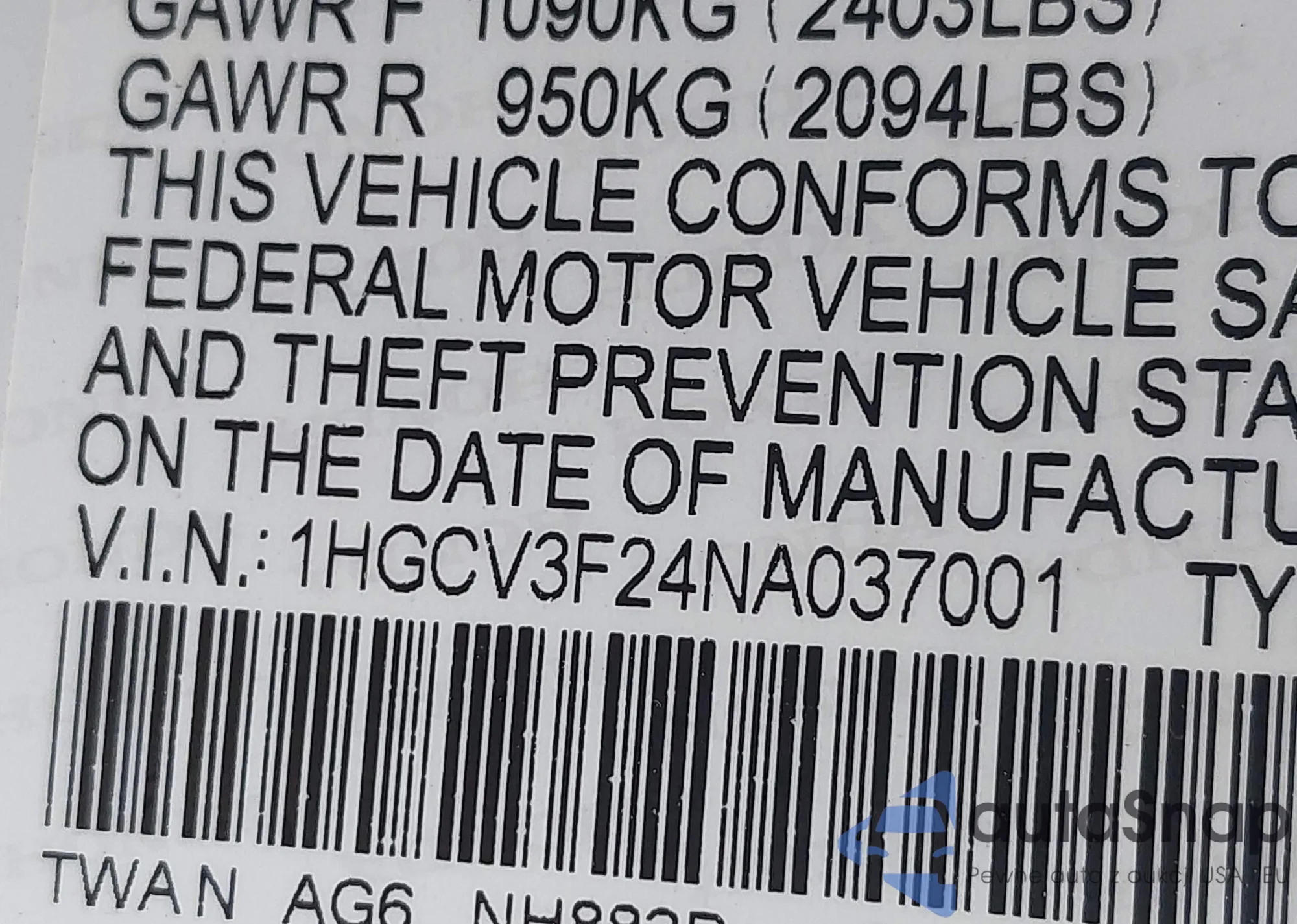 VIN: 1HGCV3F24NA037001