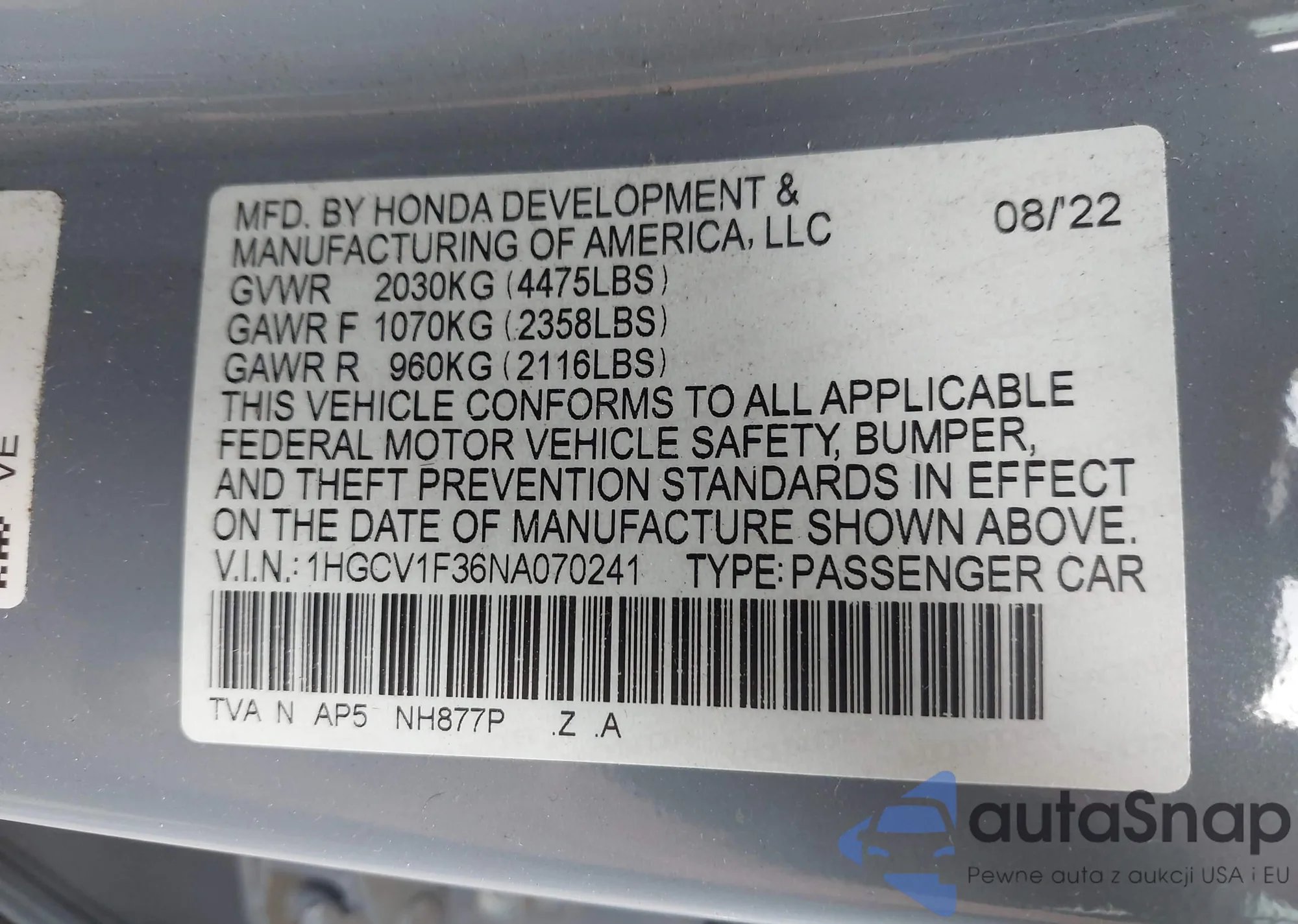 The car Honda Accord 2022 (VIN 1HGCV1F36NA070241) has not been auctioned before. The documents are clean, and the mileage matches or is below the market average. Sold by an insurance company – we recommend purchase. Delivery to the port will take approx. 6–8 weeks.