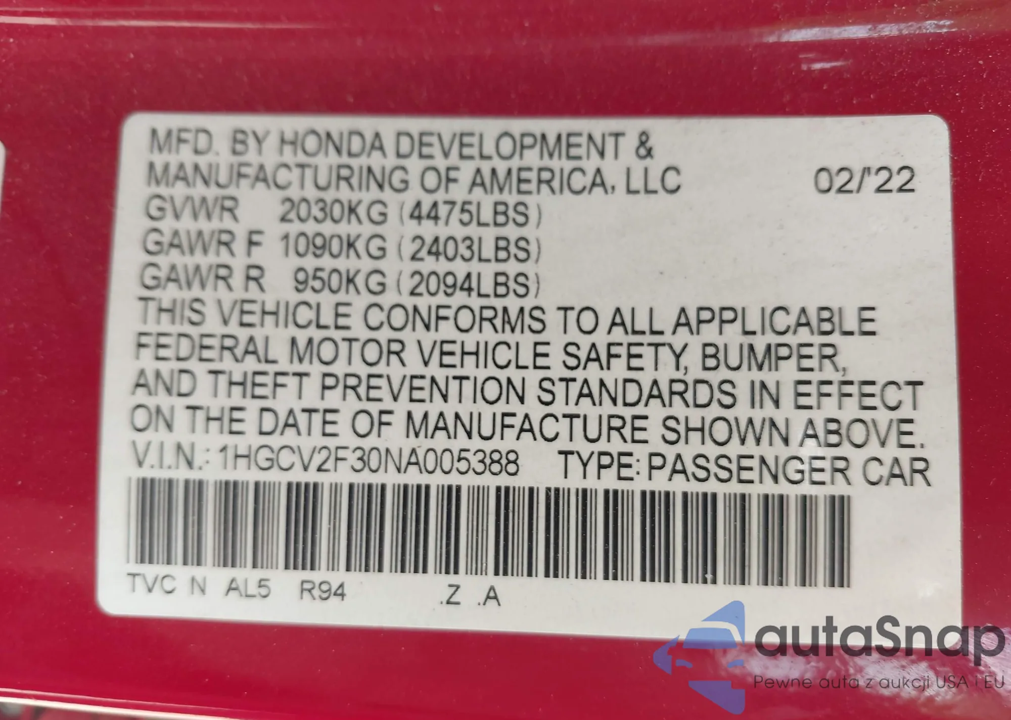 • VIN: 1HGCV2F30NA005388