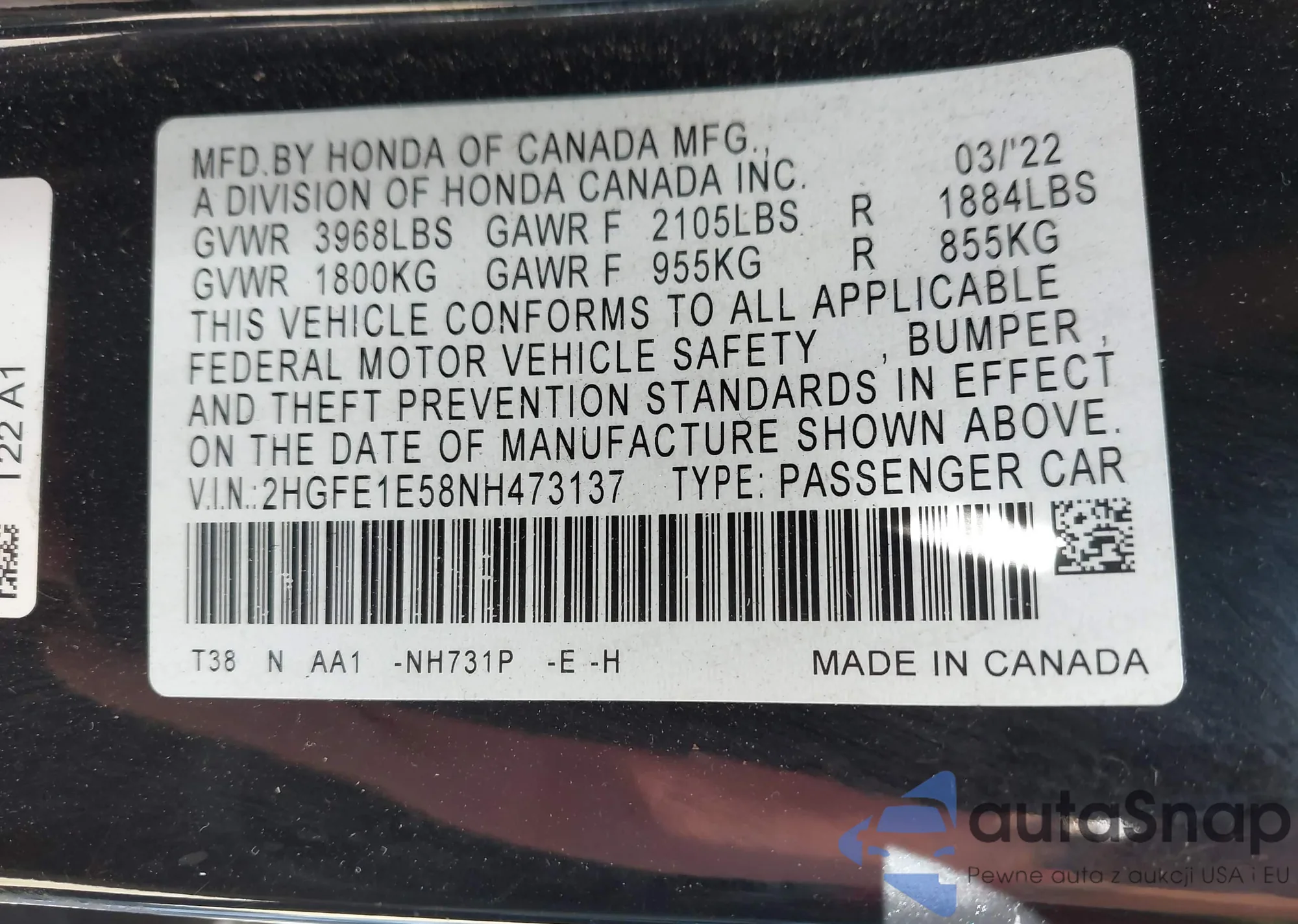 VIN: 2HGFE1E58NH473137