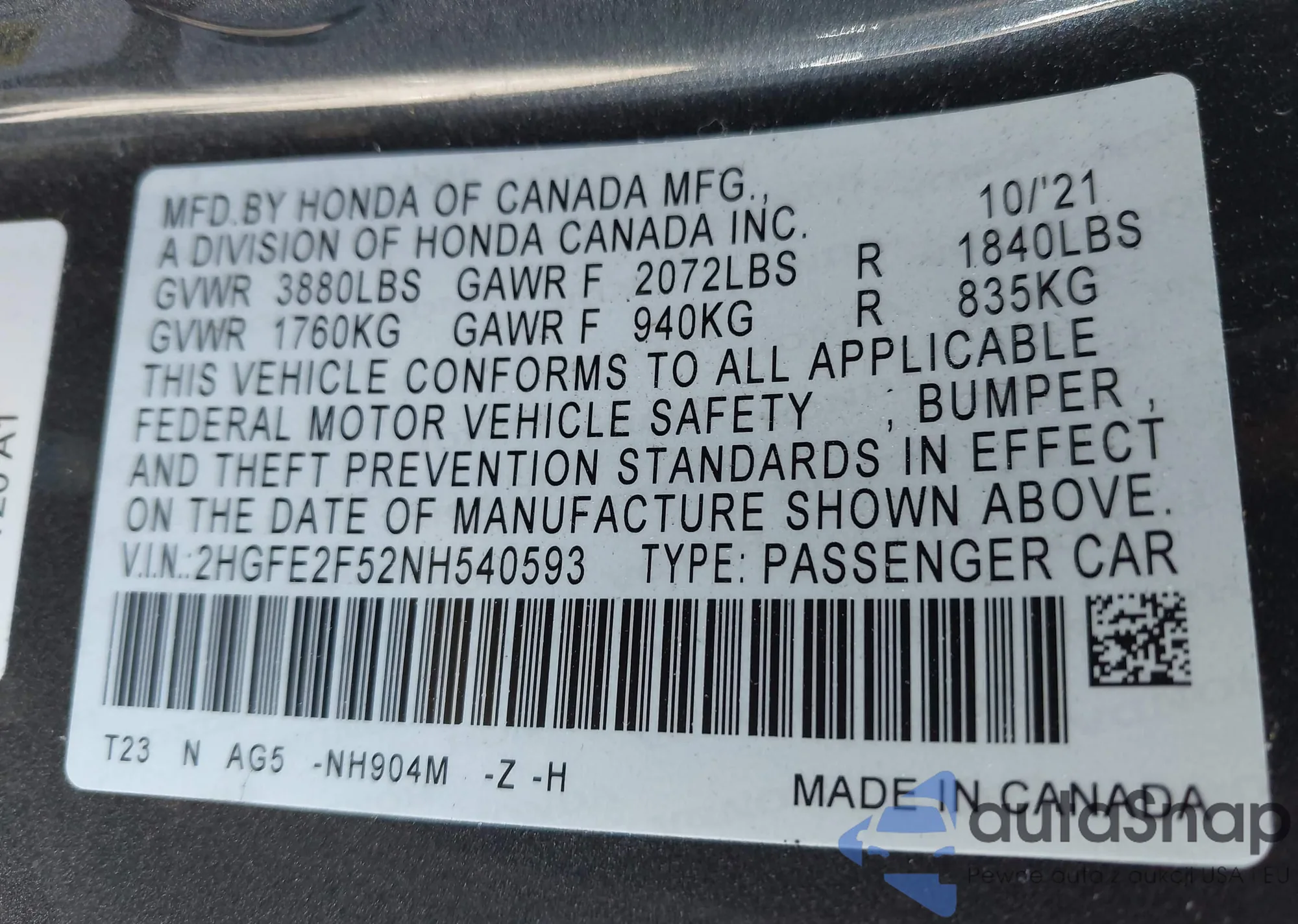 • VIN: 2HGFE2F52NH540593