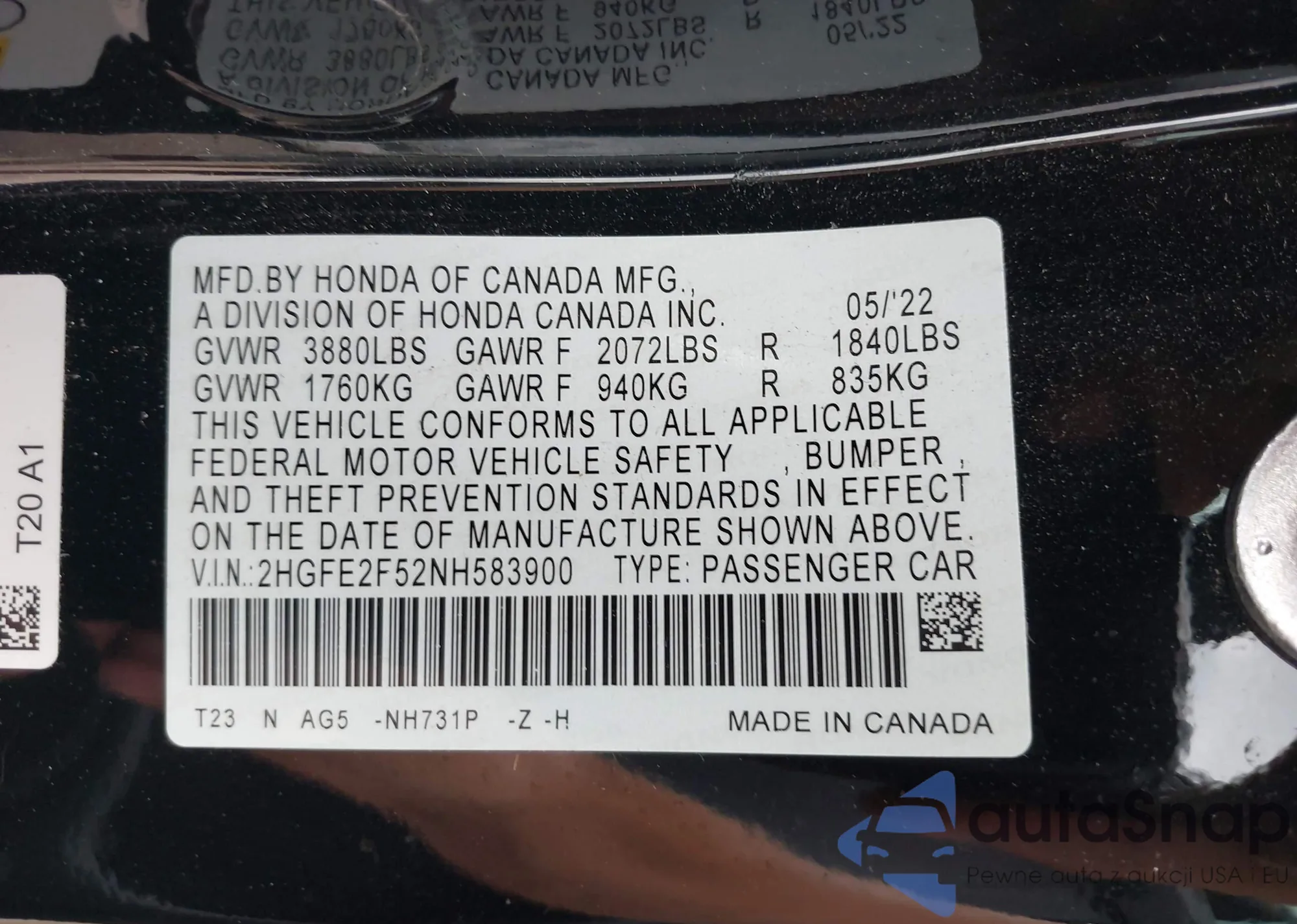 • VIN: 2HGFE2F52NH583900
