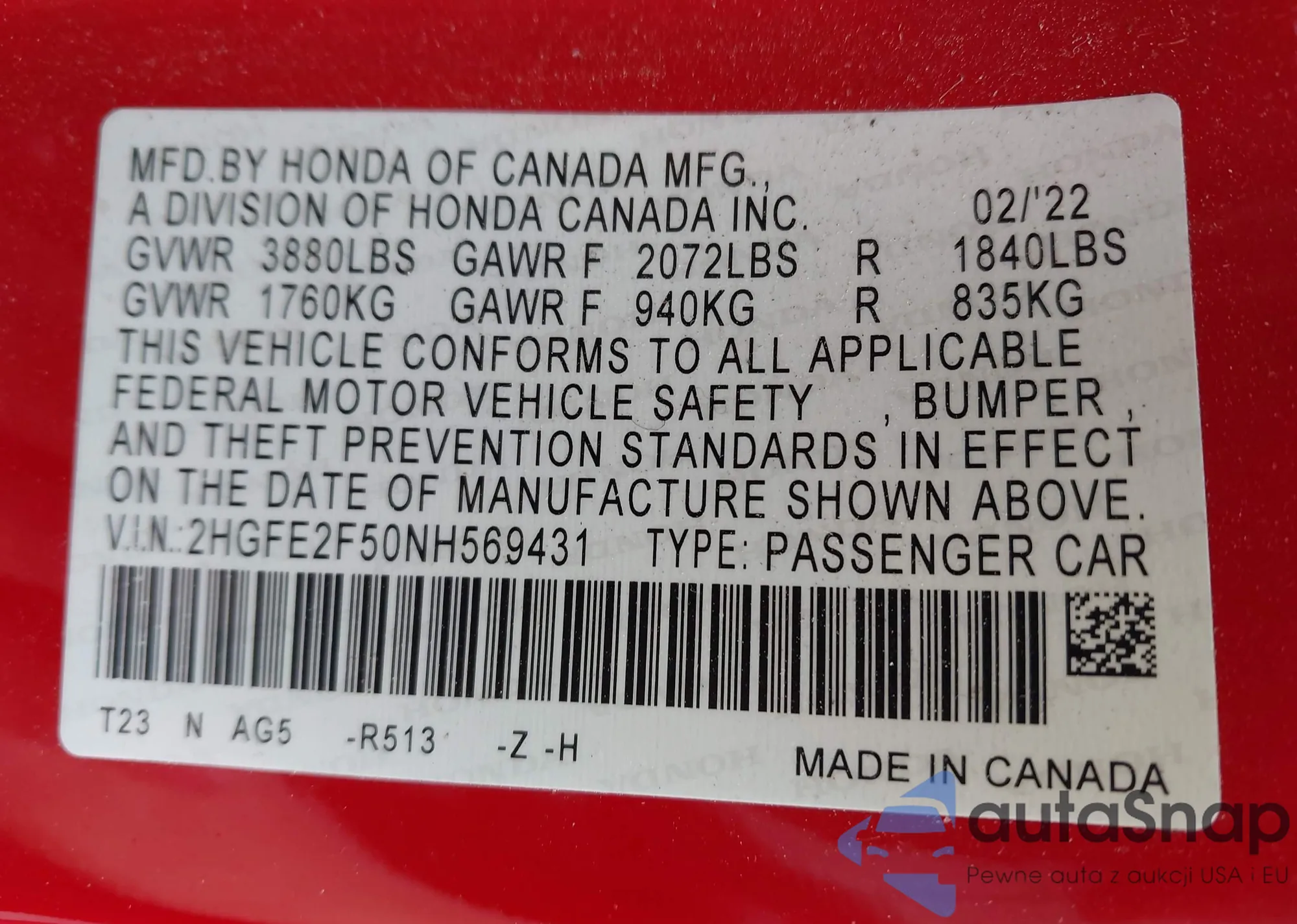 VIN: 2HGFE2F50NH569431