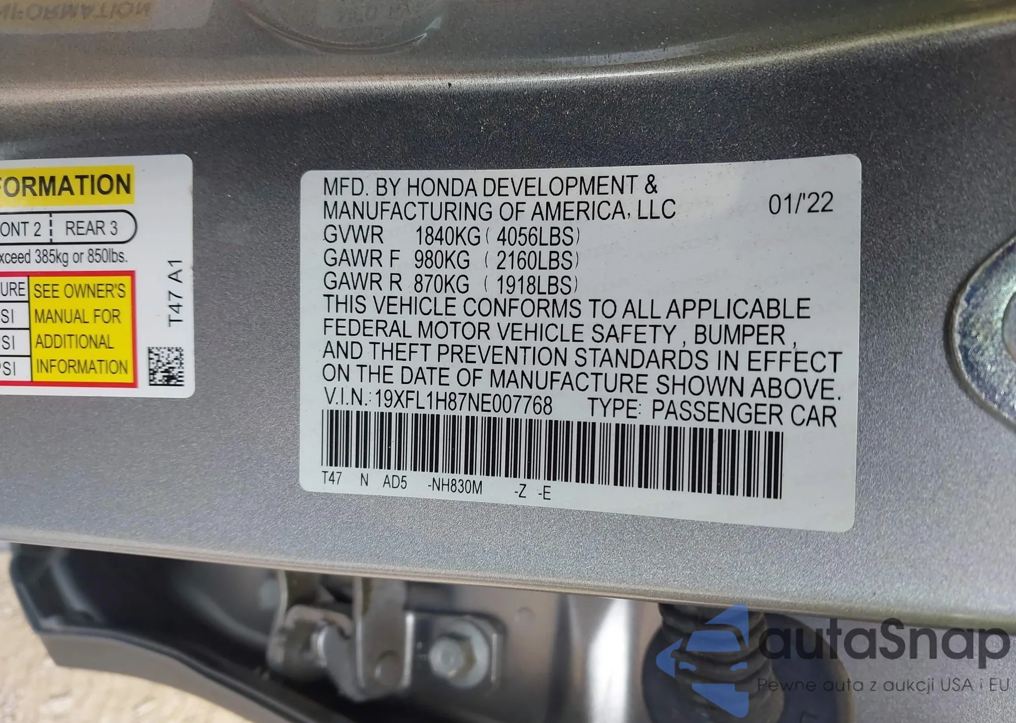 VIN: 19XFL1H87NE007768