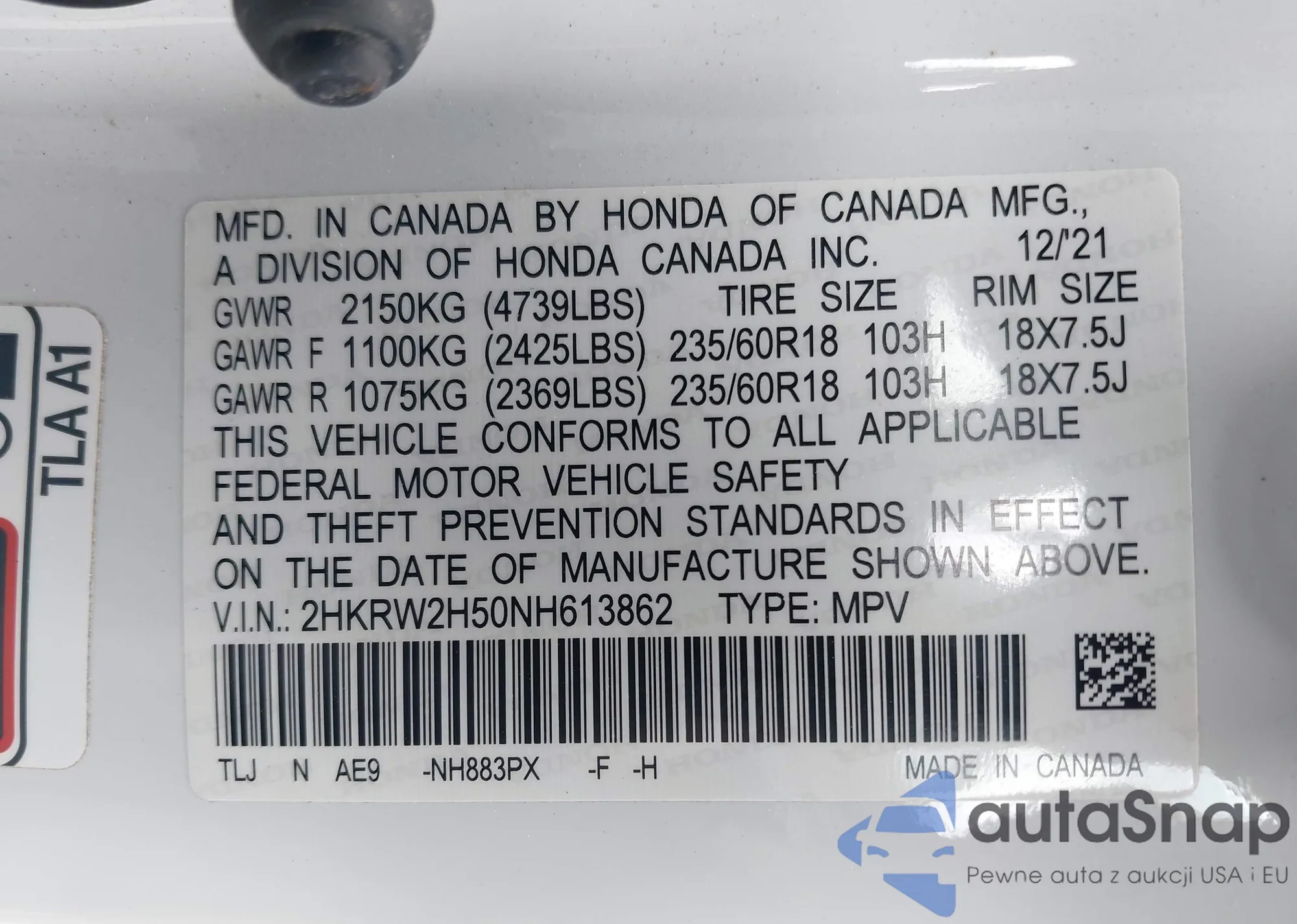 • VIN: 2HKRW2H50NH613862