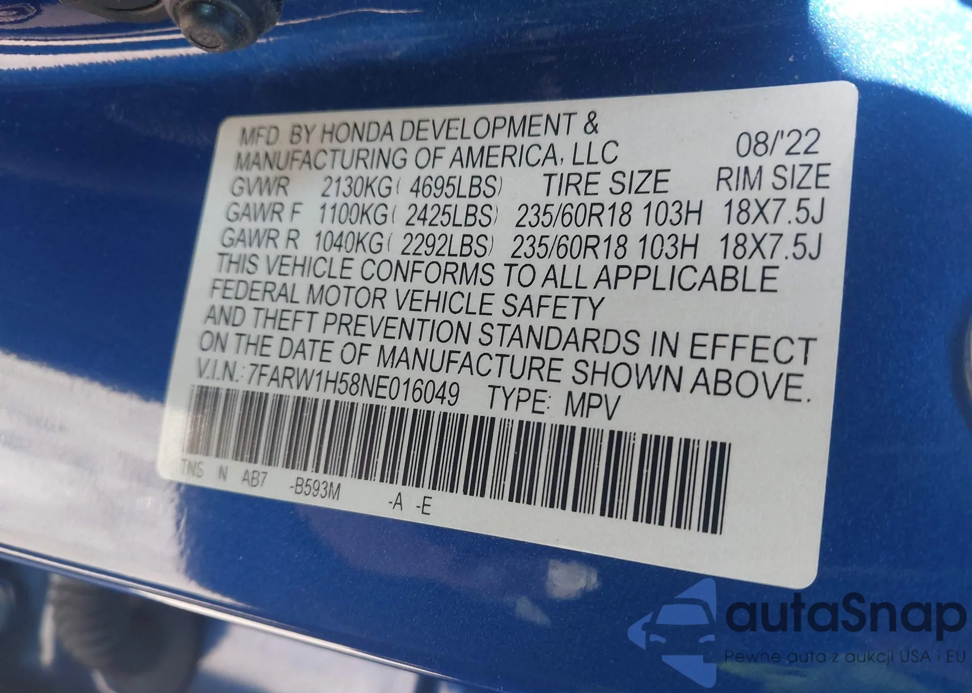 VIN: 7FARW1H58NE016049