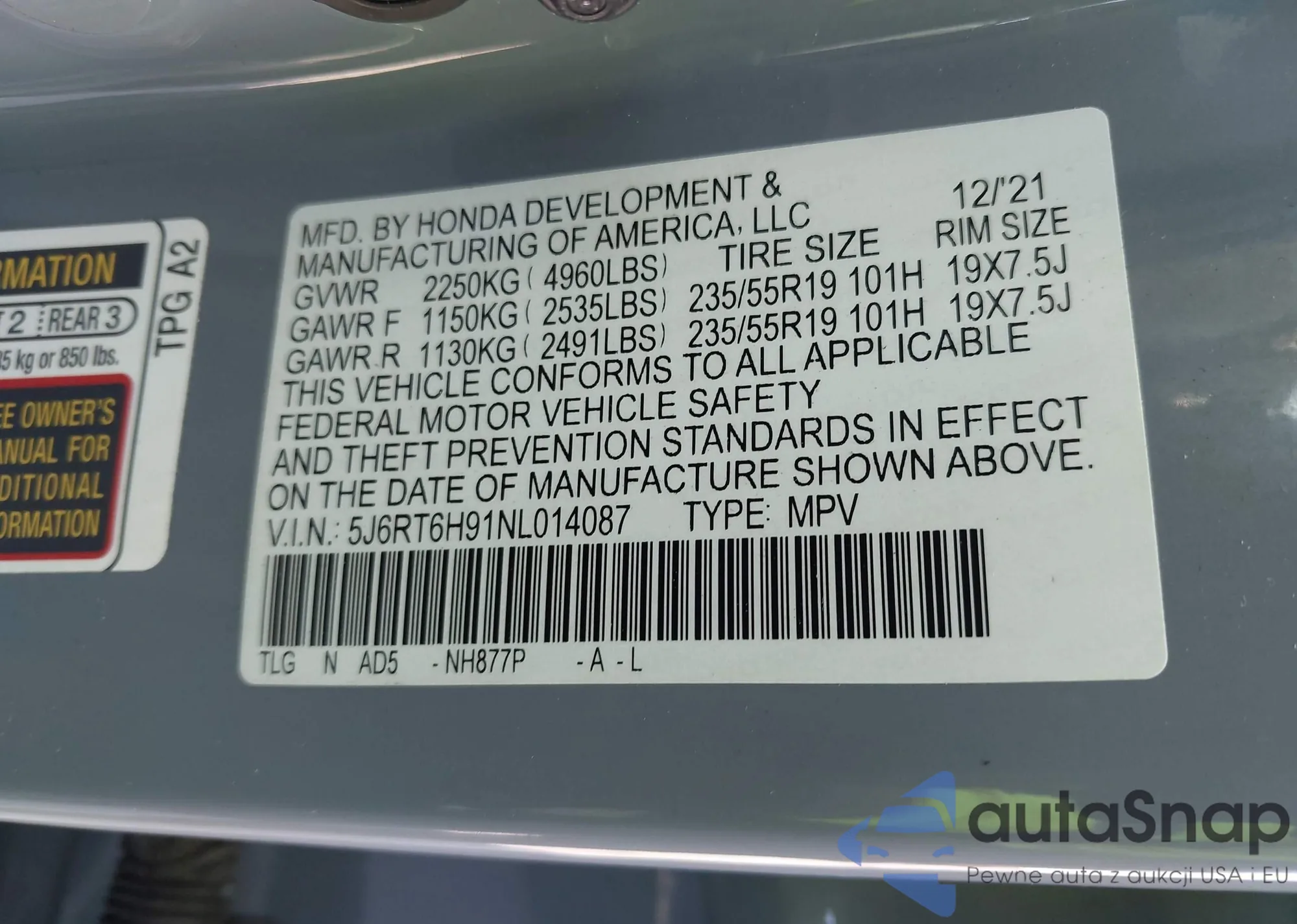VIN: 5J6RT6H91NL014087