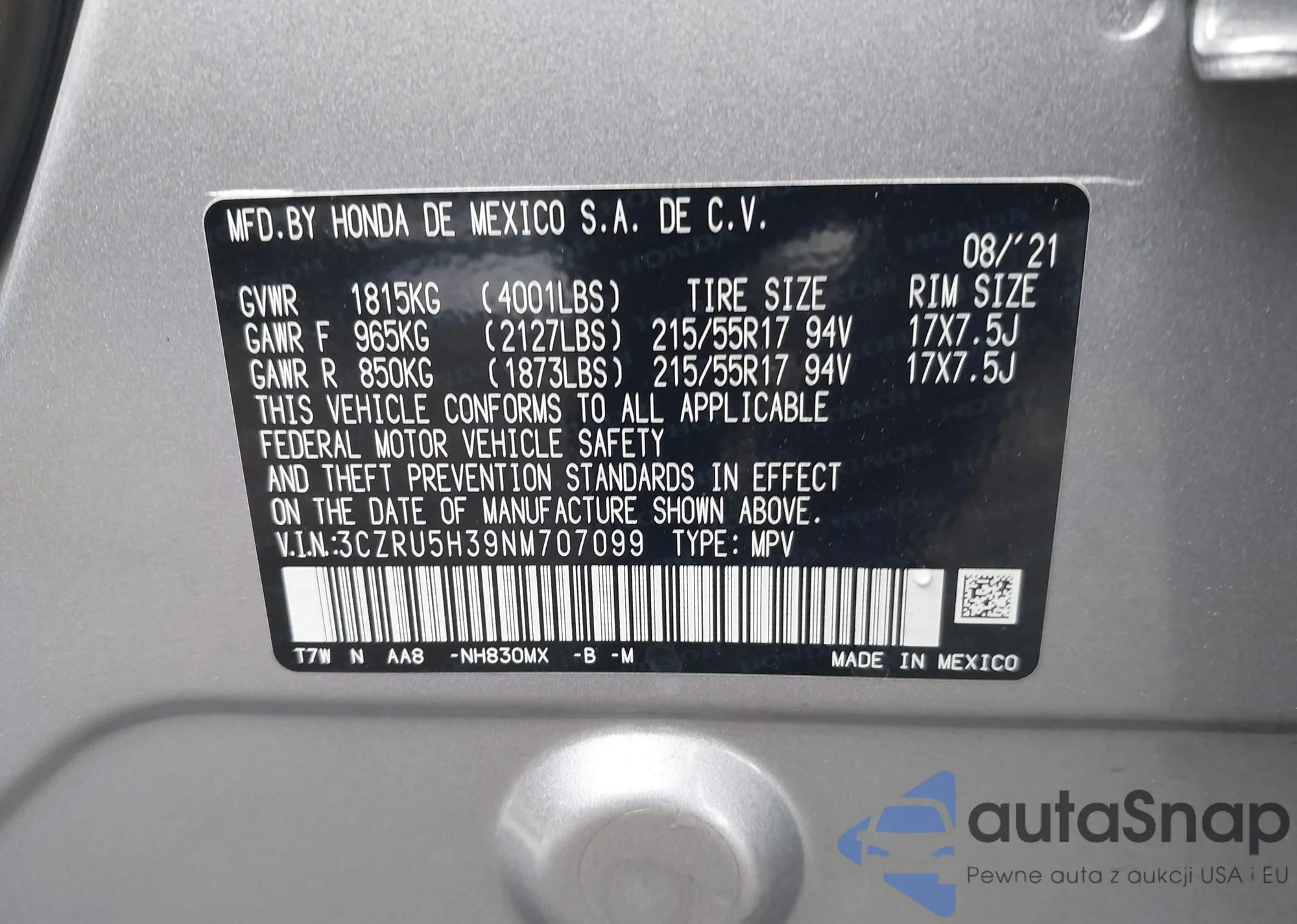 VIN: 3CZRU5H39NM707099