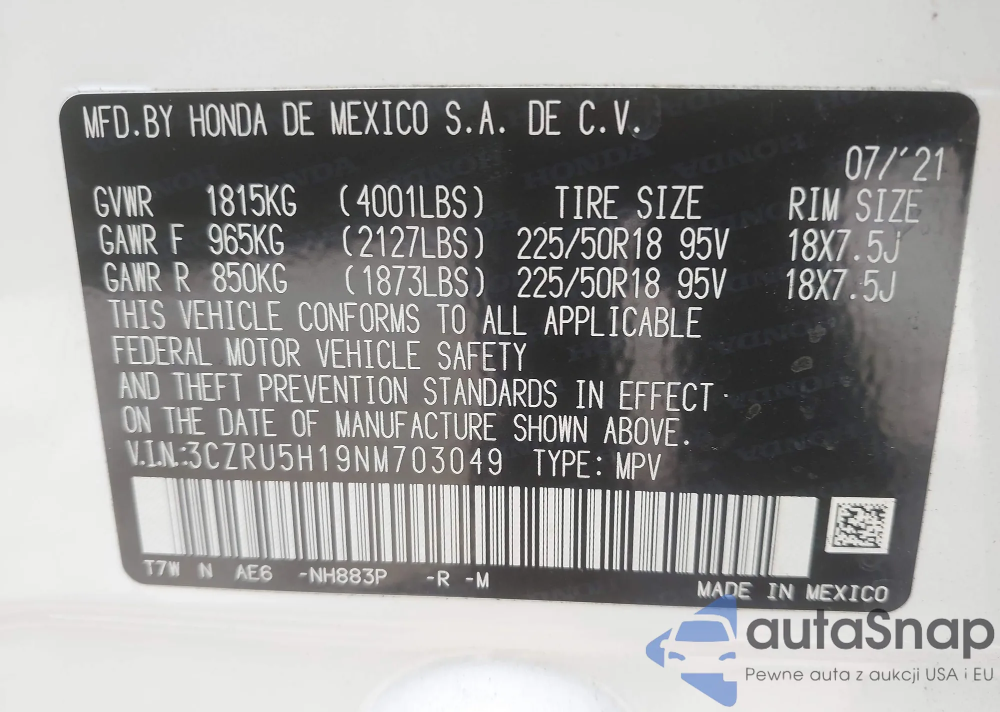 VIN: 3CZRU5H19NM703049