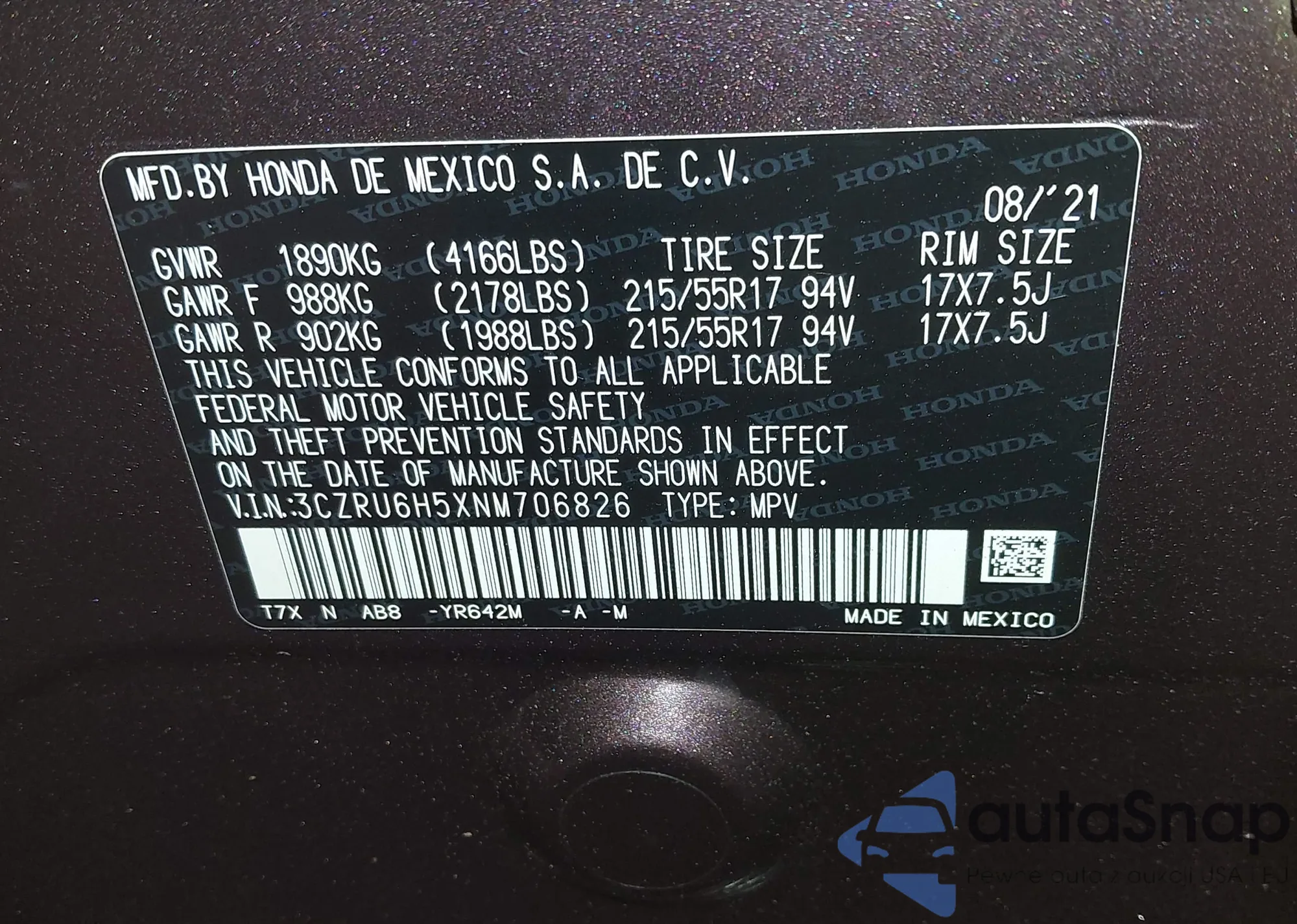 VIN: 3CZRU6H5XNM706822