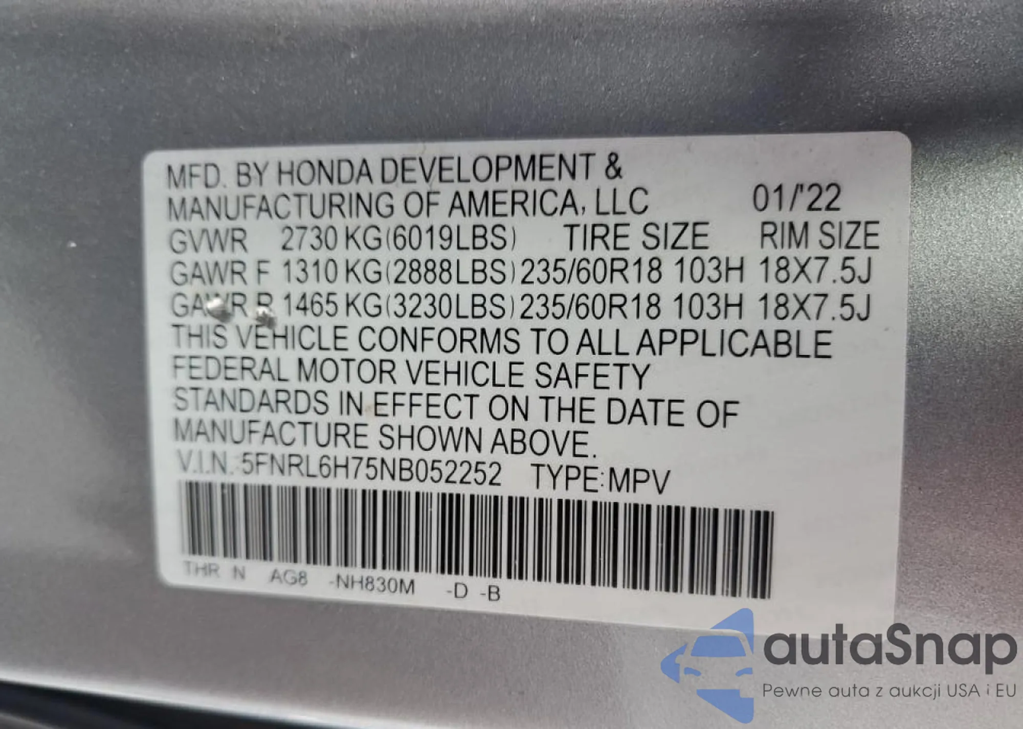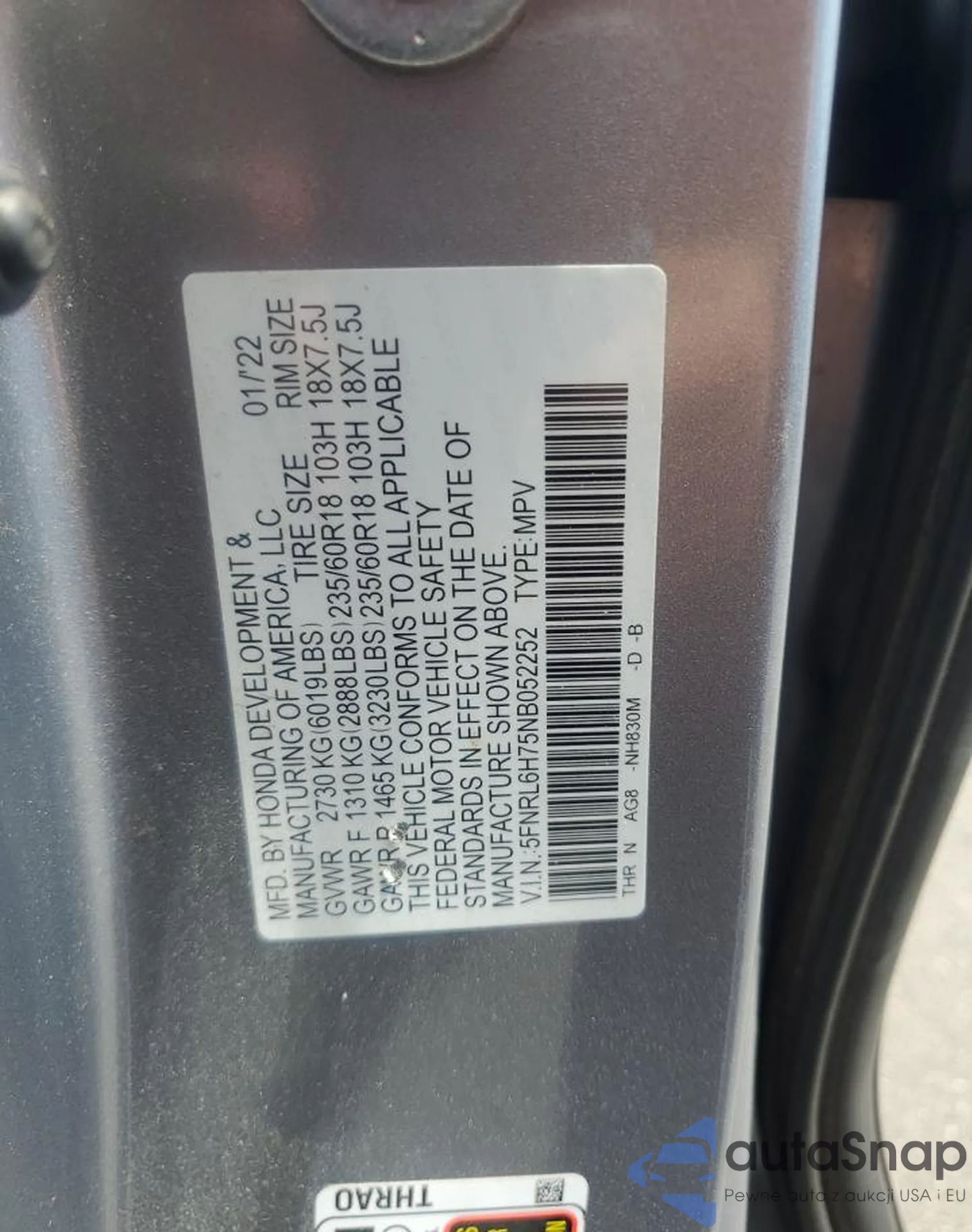 VIN: 5FNRL6H75NB052252