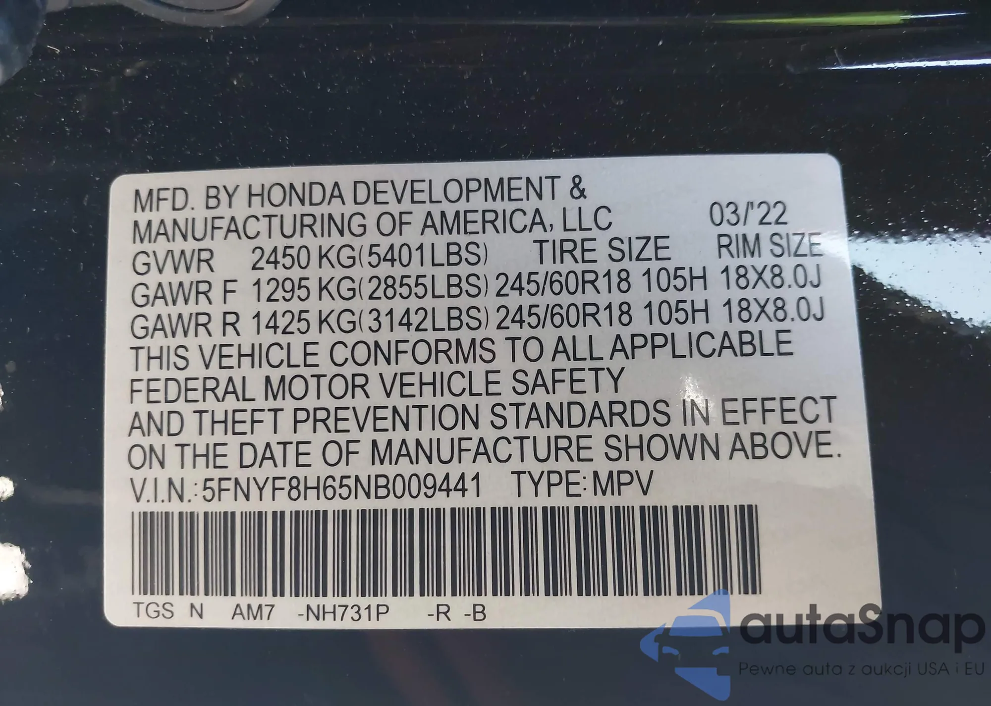 VIN: 5FNYF8H65NB009441