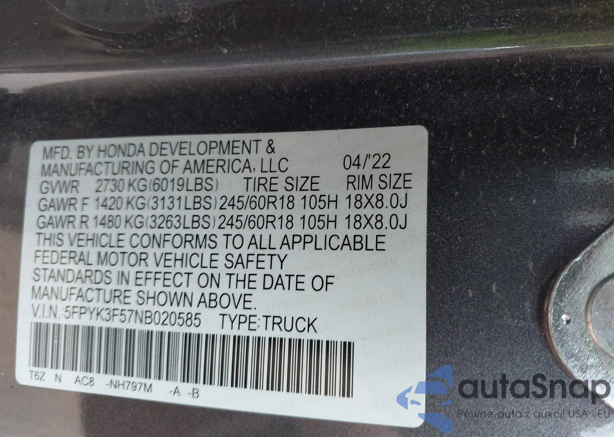 VIN: 5FPYK3F57NB020585