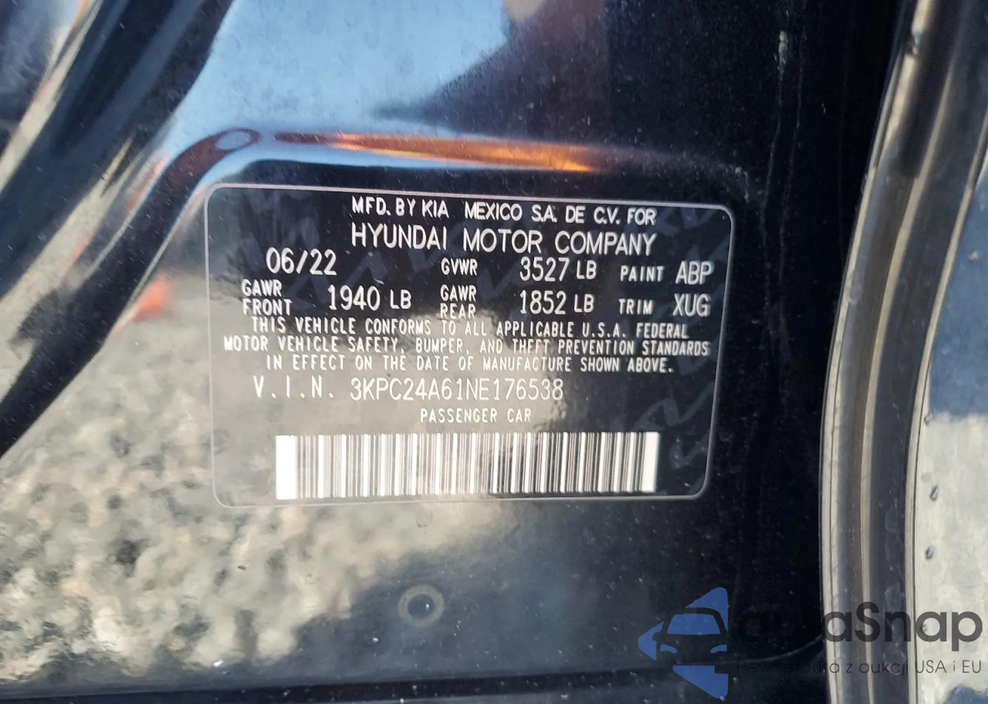 The car Hyundai Accent 2022 (VIN 3KPC24A61NE176538) has documents that prevent registration. Export and registration may be difficult. Contact AutaSnap experts to find alternatives.