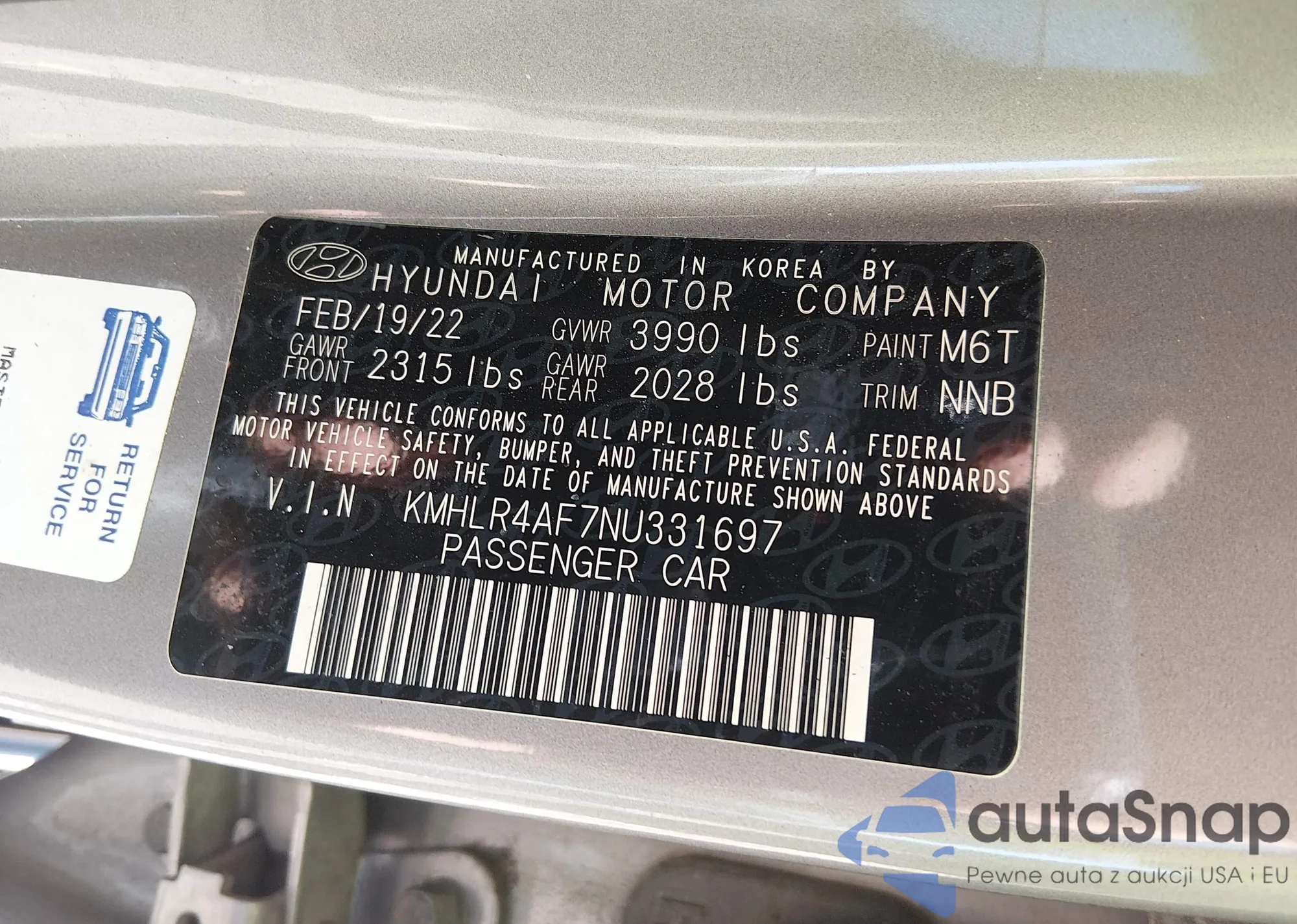 The car Hyundai Elantra 2022 (VIN KMHLR4AF7NU331697) has not been auctioned before. The documents are clean, and the mileage matches or is below the market average. Sold by an insurance company – we recommend purchase. Delivery to the port will take approx. 6–8 weeks.