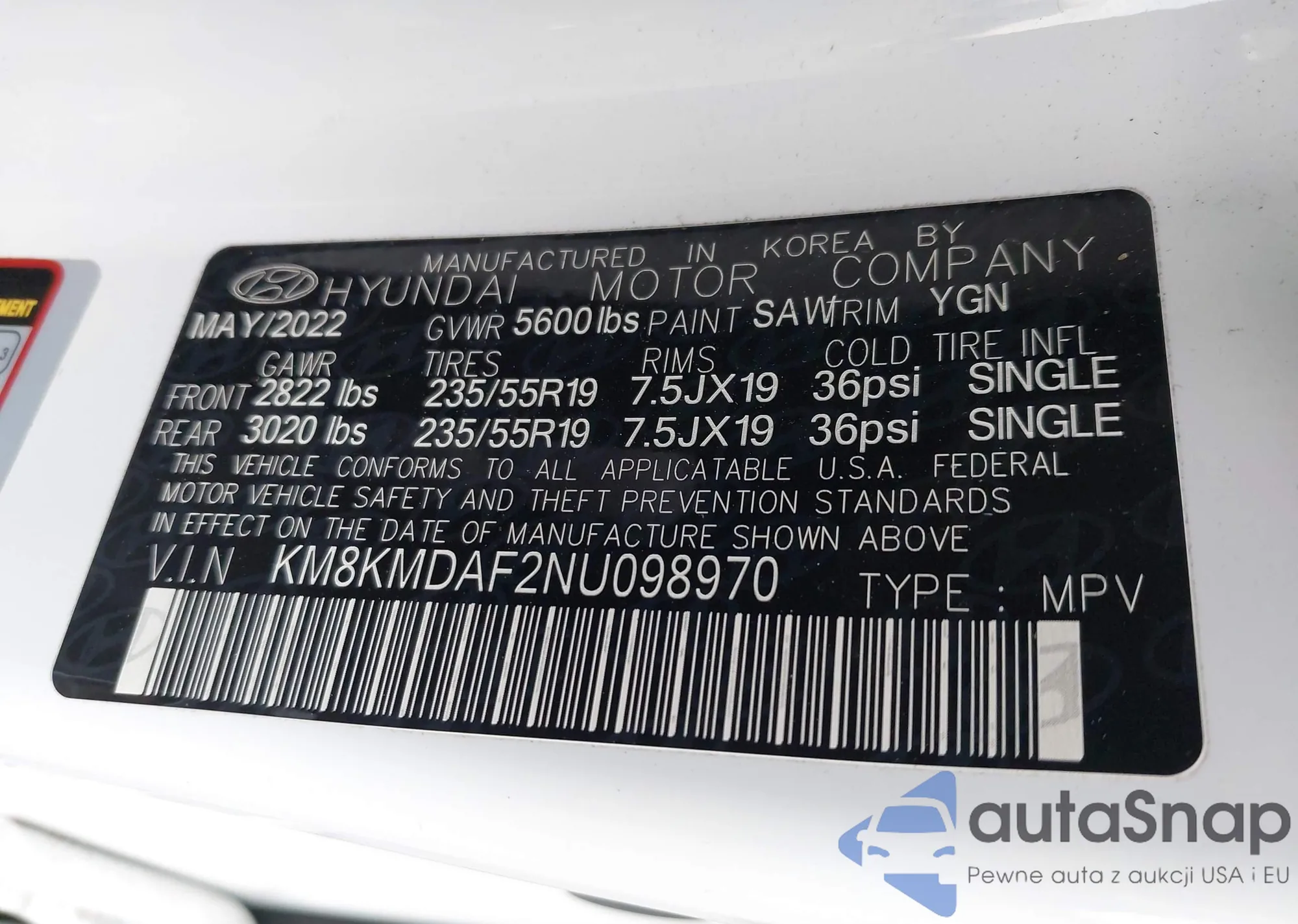 • VIN: KM8KMDAF2NU098970