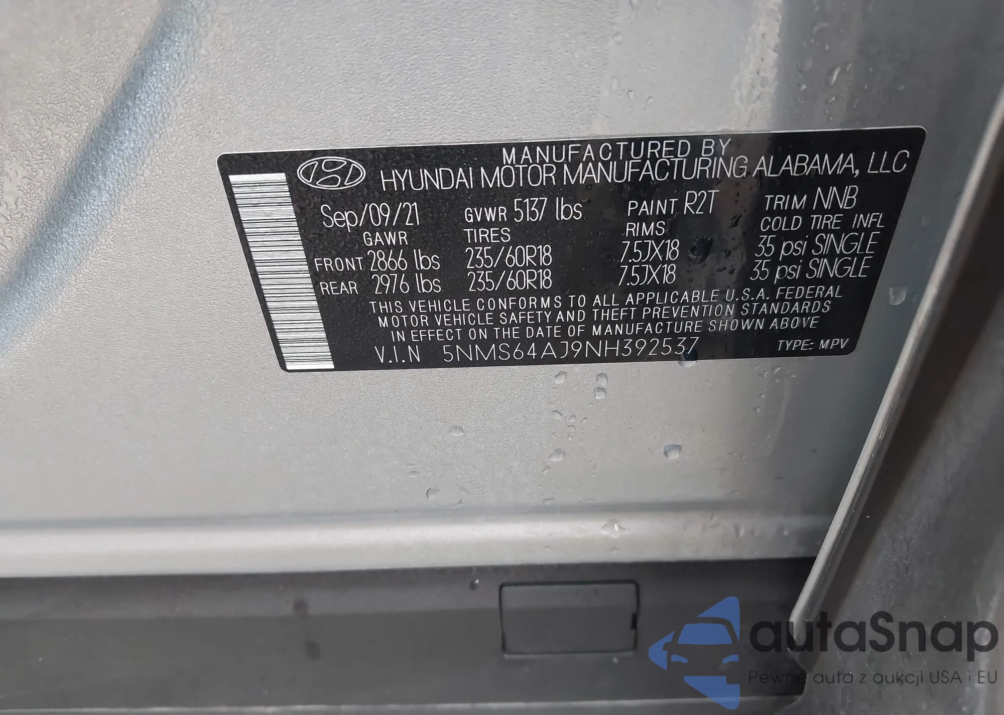 The car Hyundai Santa Fe 2022 (VIN 5NMS64AJ9NH392537) has not been auctioned before. The documents are clean, and the mileage matches or is below the market average. Sold by an insurance company – we recommend purchase. Delivery to the port will take approx. 6–8 weeks.
