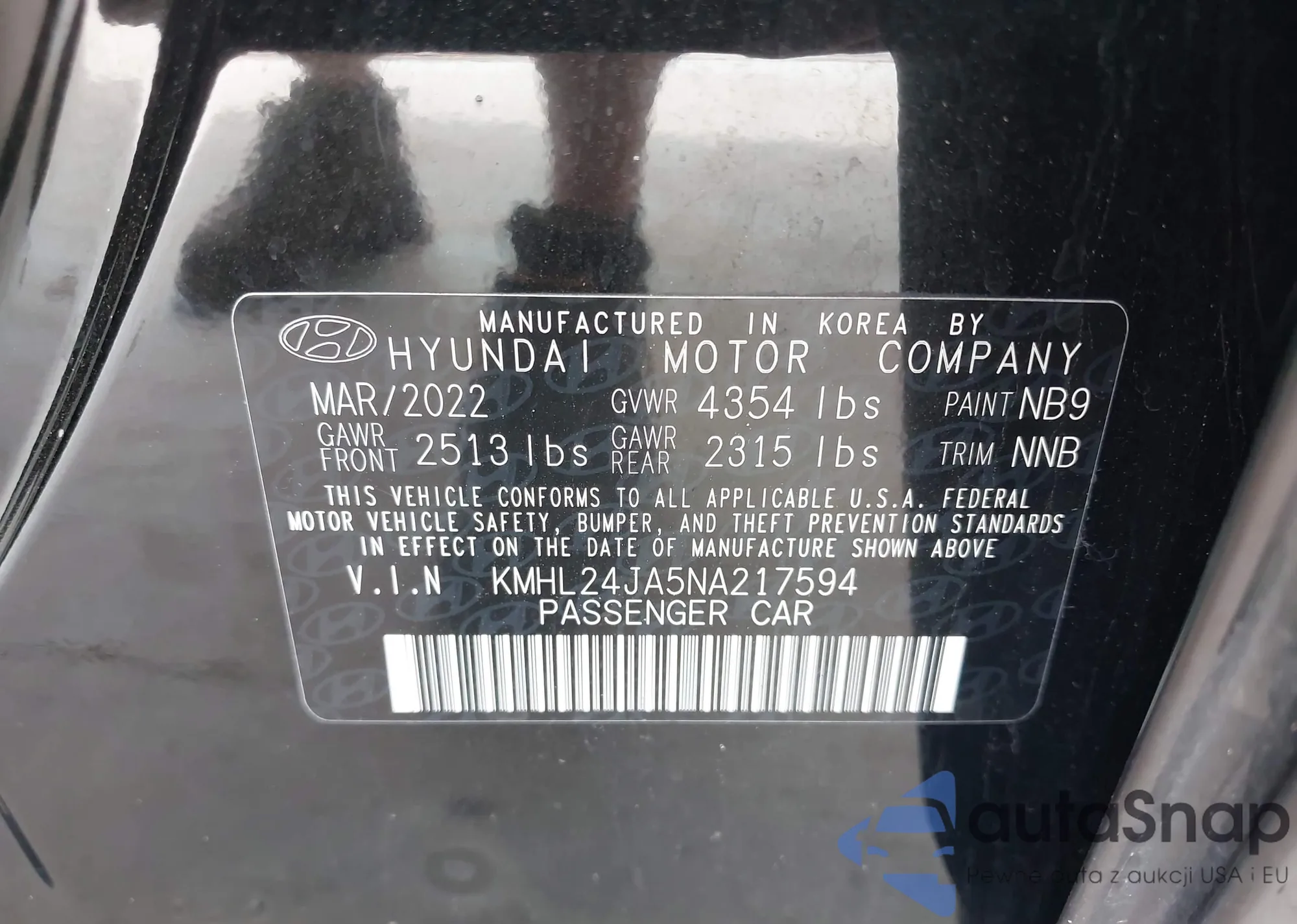 The car Hyundai Sonata 2022 (VIN KMHL24JA5NA217594) has documents that prevent registration. Export and registration may be difficult. Contact AutaSnap experts to find alternatives.