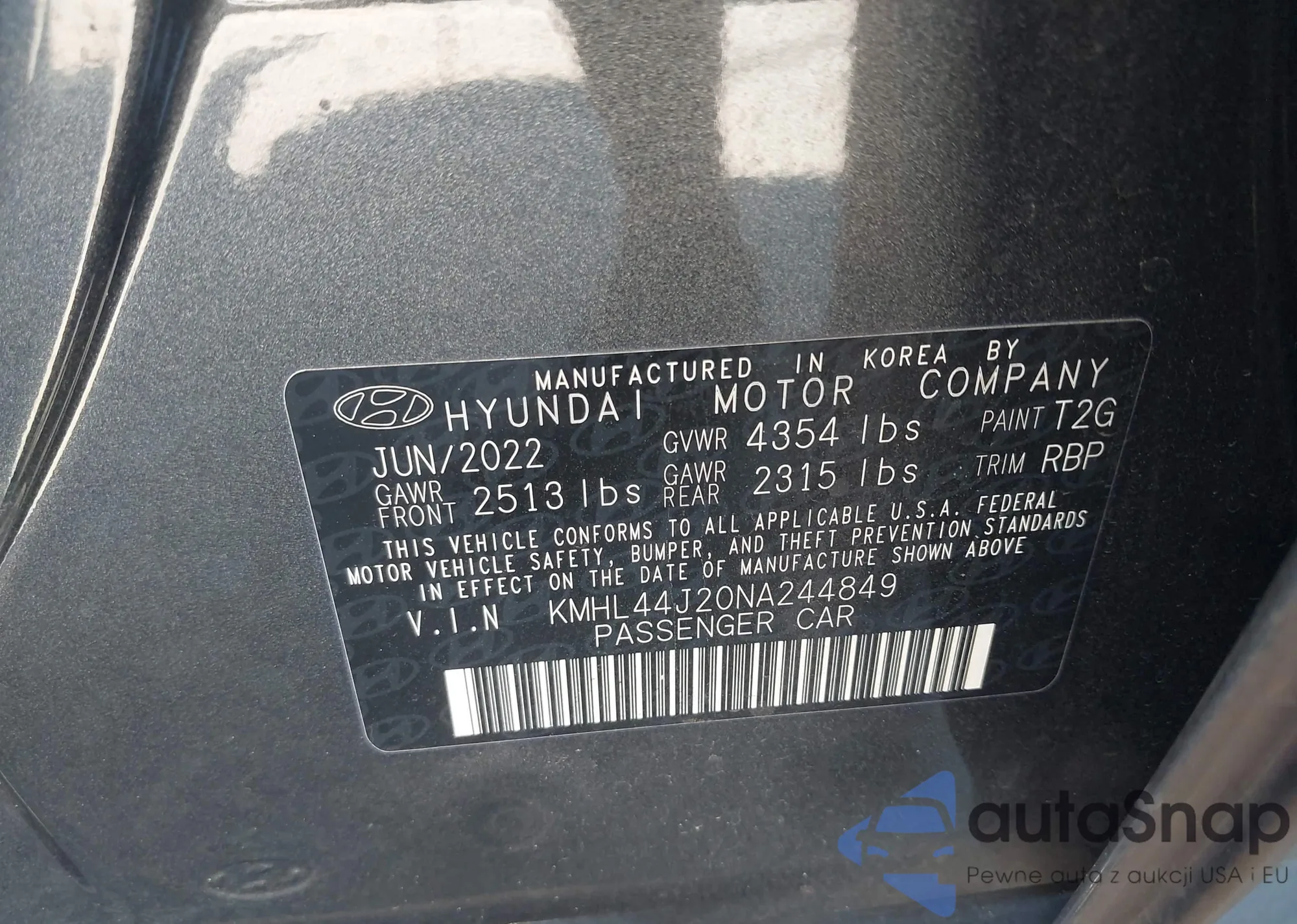 The car Hyundai Sonata 2022 (VIN KMHL44J20NA244849) has documents that prevent registration. Export and registration may be difficult. Contact AutaSnap experts to find alternatives.