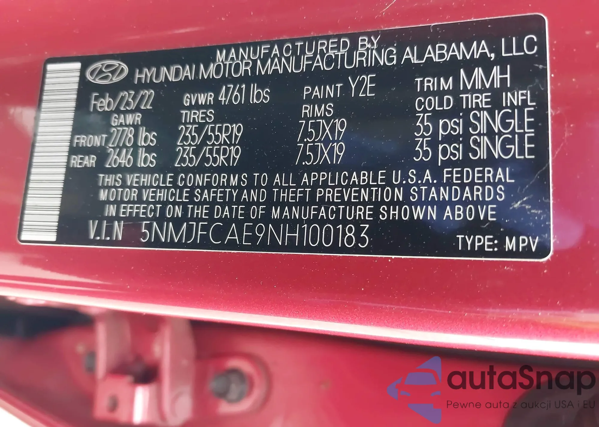 VIN: 5NMJFCAE9NH100183