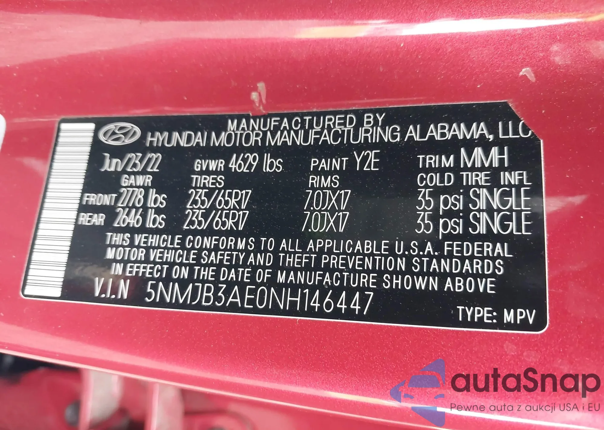 VIN: 5NMJB3AE0NH146447