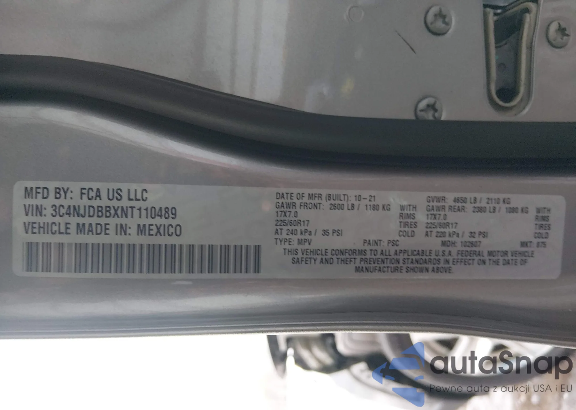 The car Jeep Compass 2022 (VIN 3C4NJDBBXNT110489) is sold by an unverified seller. We recommend checking the Carfax report and confirming registration possibilities before purchase.