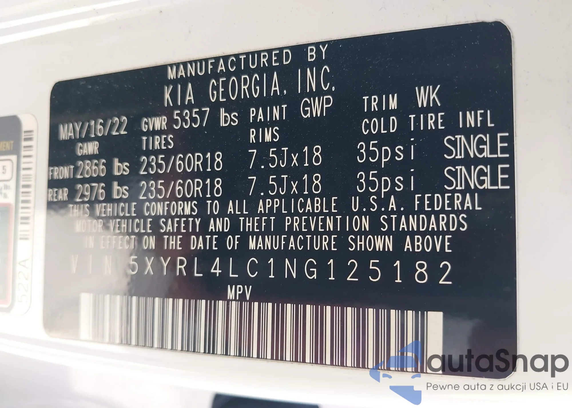The car Kia Sorento 2022 (VIN 5XYRL4LC1NG125182) has not been auctioned before. The documents are clean, and the mileage matches or is below the market average. Sold by an insurance company – we recommend purchase. Delivery to the port will take approx. 6–8 weeks.